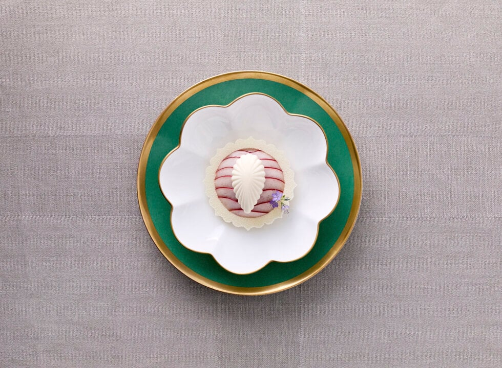 甜点:Variation on Swedish apples. Terrine made from caramelised Frida apples. Brown butter cake made from tiger nuts flavoured with spruce shoots. Cream of quince fruit and thinly sliced apples with chamomile. Served with ice cream made with pineapple weed and punsch liqueur.