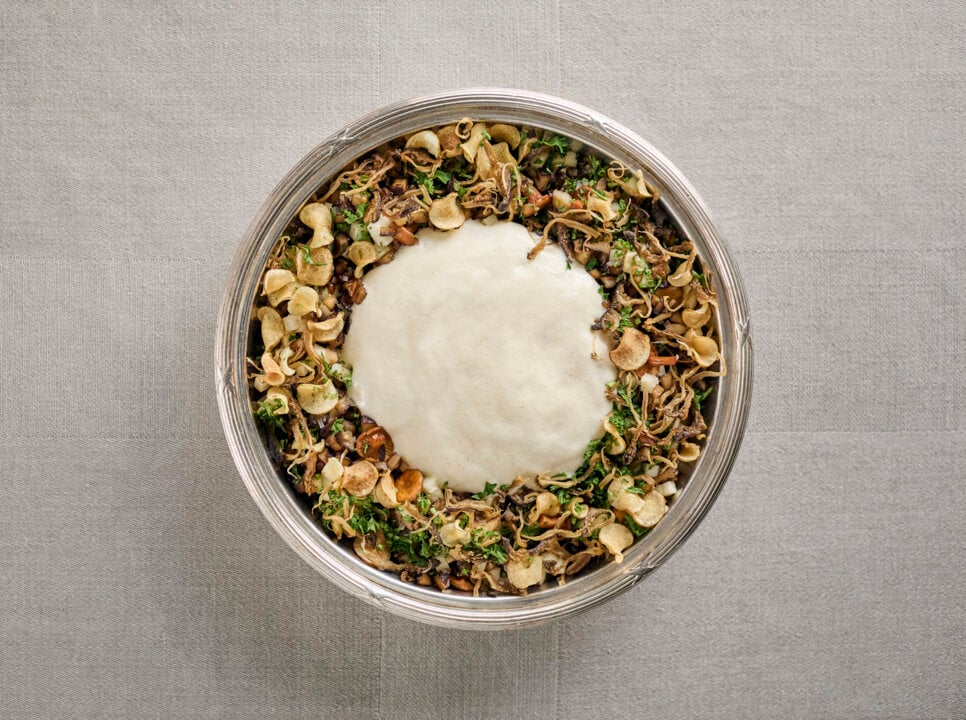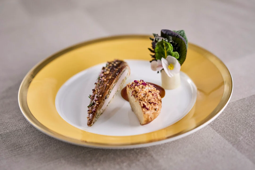 主菜:Quenelle of chicken, Swedish legumes and autumn truffle from Gotland. Celeriac glazed with miso on Swedish broad beans and a cabbage bouquet with taste of herbs and apple. Served with a modern cultural creamed steel-cut barley with wild and cultivated mushrooms, Jerusalem artichoke and roasted chicken jus with Pomme de Vie.