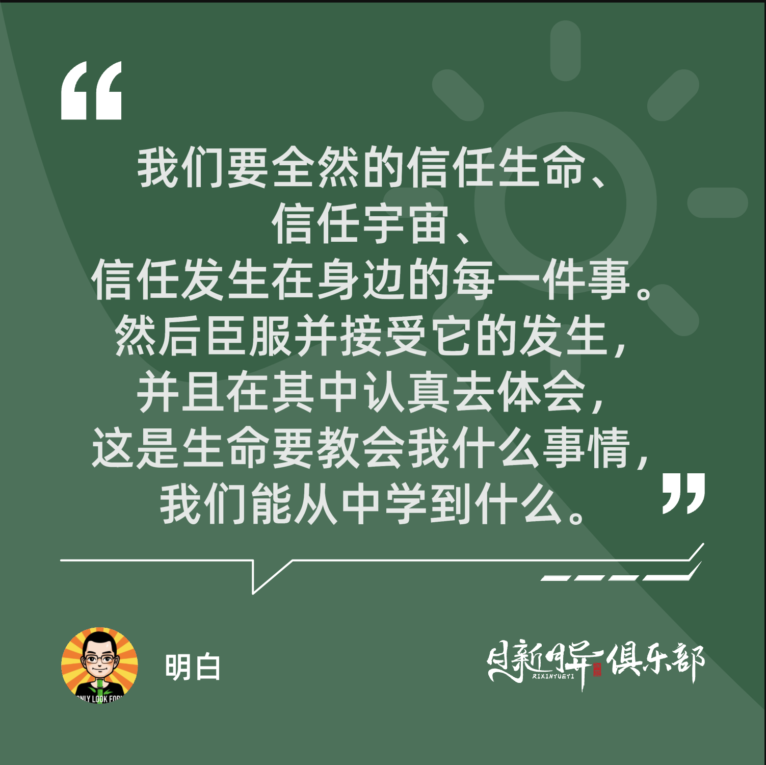 我们要全然的信任生命、信任宇宙、信任发生在我们身边的每一件事,然后臣服并接受它的发生,并且在其中认真去体会,