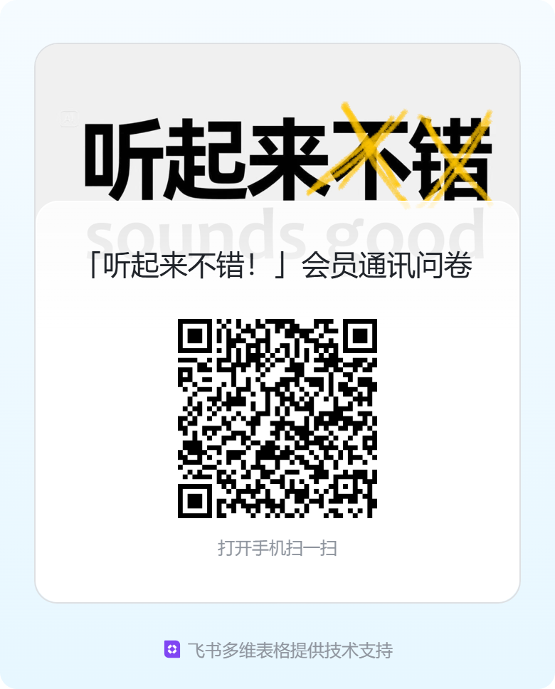 为了回报你的支持,我会为你发送每月至少 1 封「听起来不错!」会员通讯邮件。邮件内容是我日常关于创作的一些思考,以及没办法在节目中呈现的延展资料、音乐、或者声音片段。你可以在下面的问卷中填写你的邮箱。填写地址:i0qz2np0sd.feishu.cn (或扫码填写)。