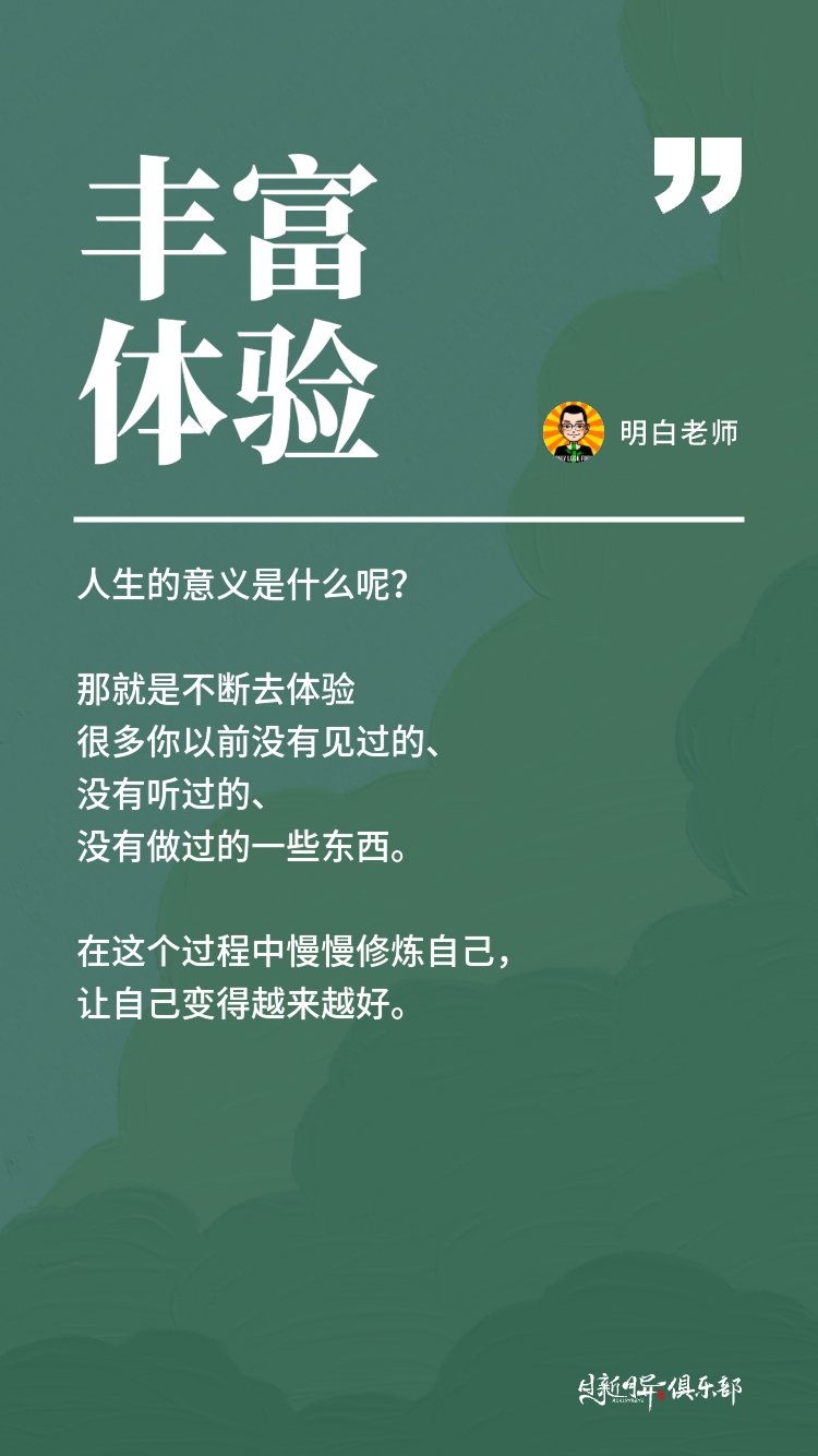 那就是不断去体验很多你以前没有见过的、没有听过的、没有做过的一些东西,在这个过程中慢慢修炼自己,让自己变得越来越好。
