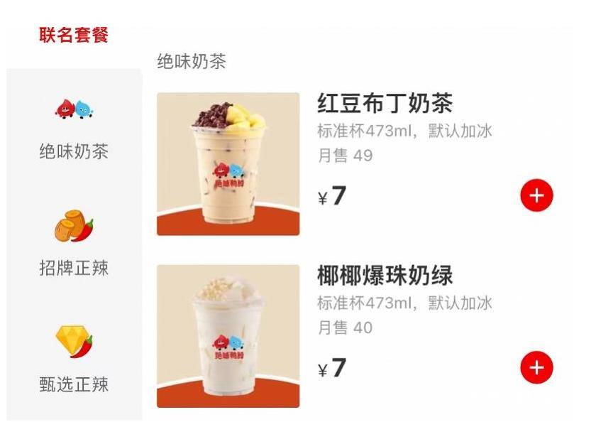 红星资本局查询绝味鸭脖官方点单小程序,发现大部分门店还未上架奶茶产品。在上架的一家店铺内,“绝味奶茶”项目被放在了第二栏,有两款产品,分别为红豆布丁奶茶和椰椰爆珠奶绿,售价7元。