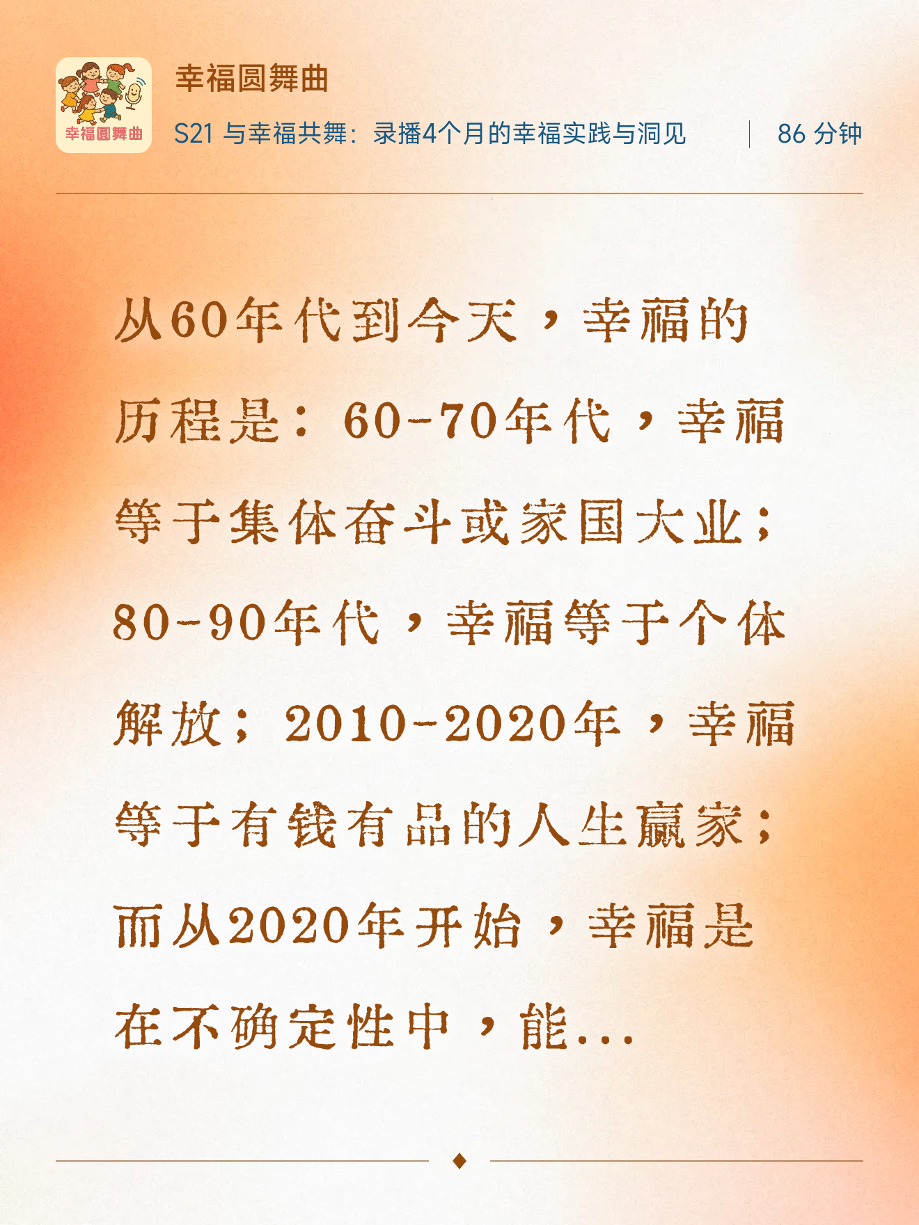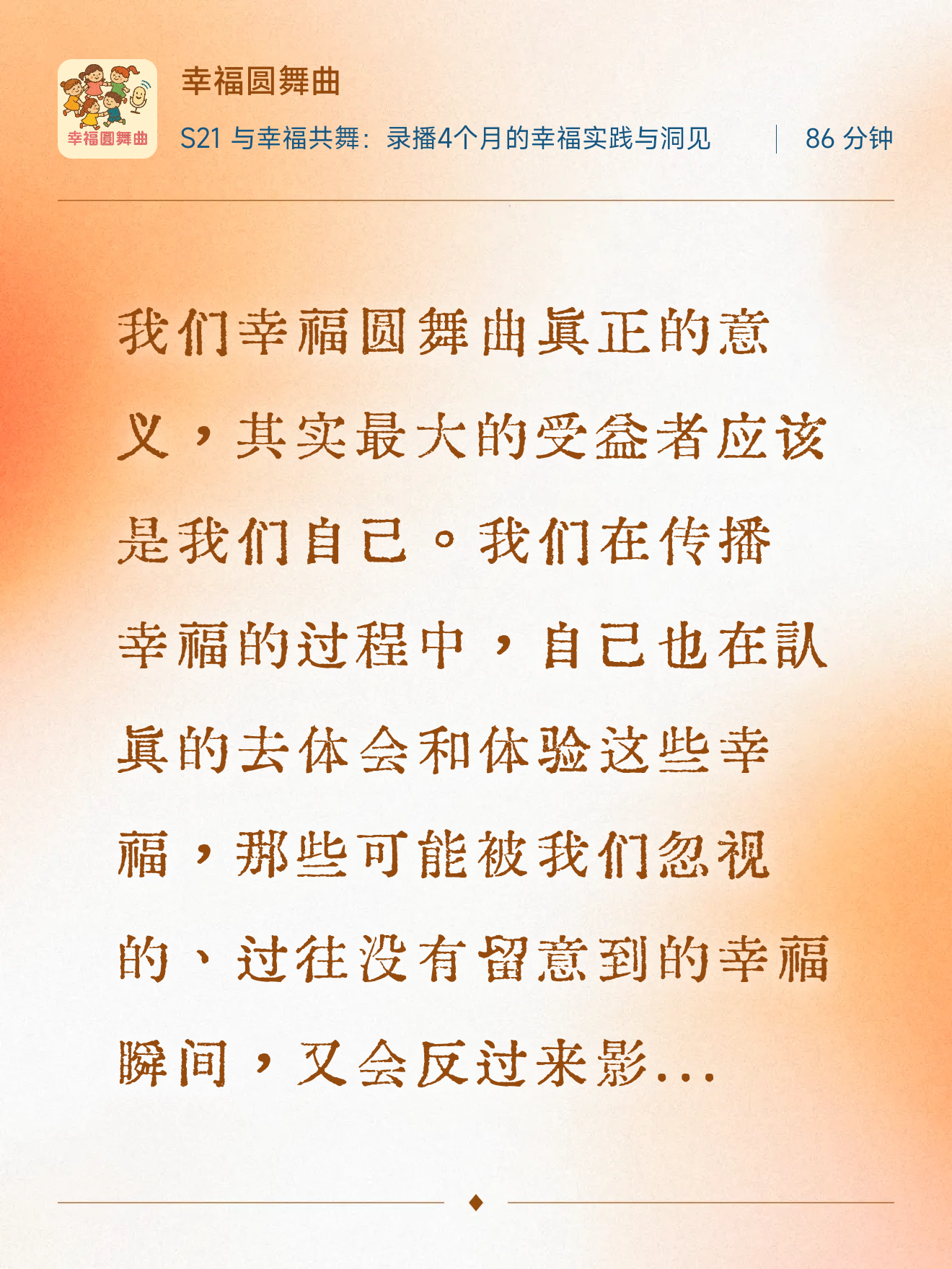 我们再次回到初心,希望通过播客“幸福圆舞曲”传递幸福理念,鼓励更多人在日常生活中实践“幸福微行动”。