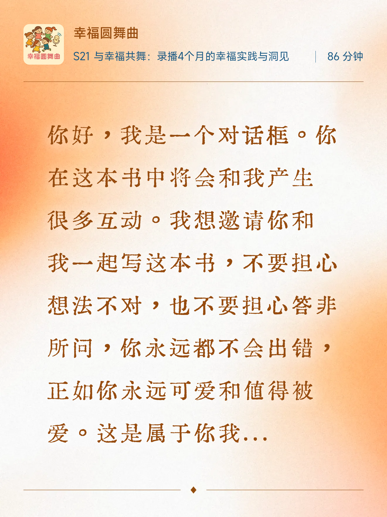 【🌈幸福圆舞曲💃·幸福同行人】听友群:欢迎各位小伙伴加入听友群,成为我们的幸福同行人,获取每月完整版幸福微行动日历📅、节目最新资讯以及幕后彩蛋。