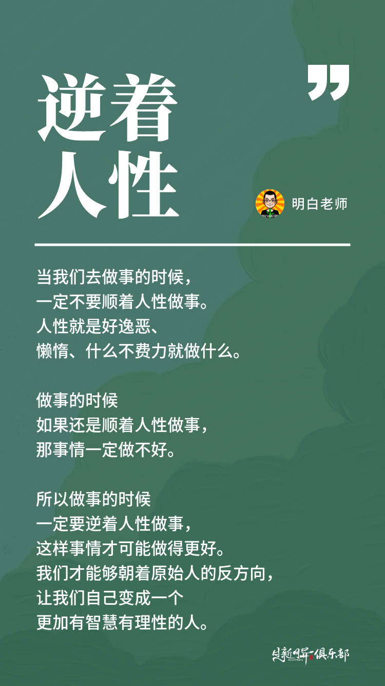 我前几天还听到罗振宇讲一句话,叫做顺着人性做人。逆着人性做事,也就是我们做人的时候要顺着人性,就是别人可能做了一件事,你要多夸奖他,而不要否定他。