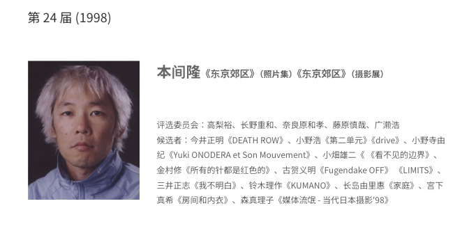 木村伊兵卫摄影赏:1975年设立, 日本朝日新闻社主办的摄影奖:木村伊兵卫奖,授予对象是追求纯粹的摄影表现价值的摄影家。入选对象不限年龄、业余或职业摄影,以每年1月至12月在杂志、摄影集、摄影展公开发表的新人作品为范围接受推荐评选。到今天为止,这个摄影奖项已经培养了大量的优秀摄影人,成为日本最重要的摄影奖项之一。北岛敬三、濑户正人、川内伦子、浅田正治、原美树子、佐内正史、藤冈亚弥等等熟悉的名字都曾获得这个奖。