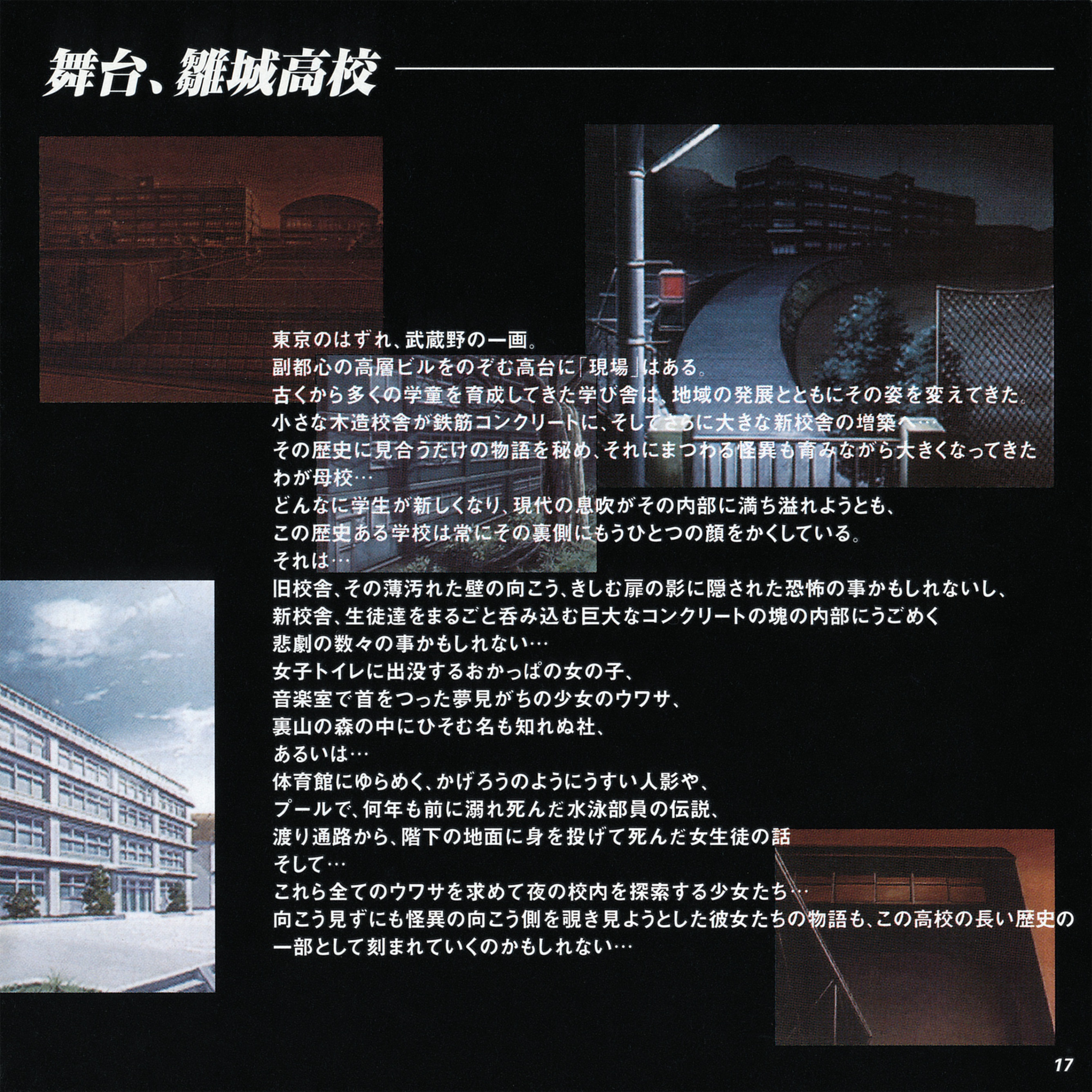 游戏故事发生在96年的夏天,雛城高校的三名高中女生长谷川由加利(長谷川ユカリ)、逸岛千慧(逸島チサト)、岸井美佳(岸井ミカ)组成了探灵作死小队,在学校以及城市的各个角落,对离奇的都市传说和灵异事件展开调查……
