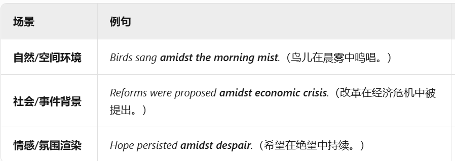 与 amid 含义完全相同,均表示 在…… 之中;在…… 过程中,但 amidst 更偏正式或文学性,口语中多用 amid。