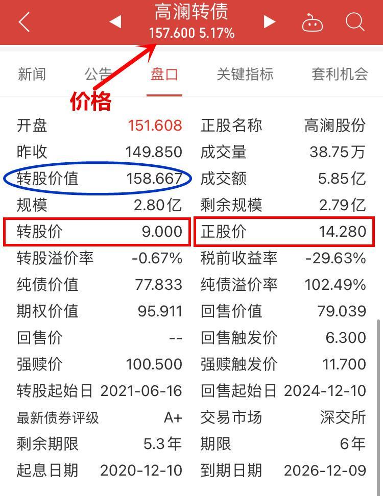 另外、有些人听了我刚才的计算可能也没听懂...对此大家可以关注一项数据:叫做“转股价值”,图片中蓝色圈圈的就是,这个数据就是系统帮你计算好的转股后的实际价值。计算方法跟我刚才说的一样。如果你买入可转债的价格比转股价值要低,说明有利差可赚,如果买入的价格比转股价值要高,说明没有利差。
