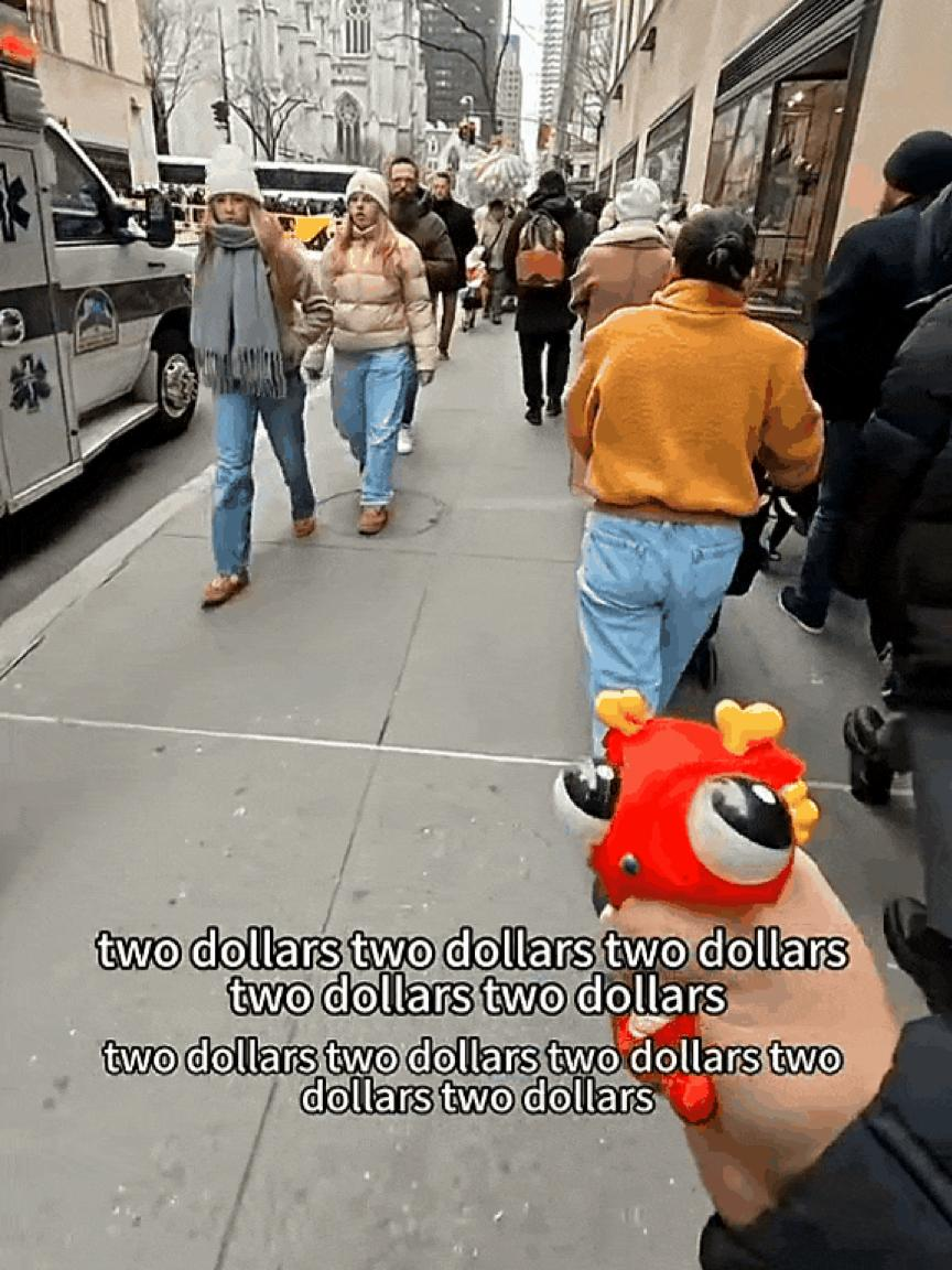 2024 年 12 月 8 日,刀乐哥在抖音发布首条视频,以第一视角记录自己在纽约时代广场用蹩脚英文 “two dollar”“one dollar” 等叫卖 “爆眼龙” 玩具的过程。其魔性口音和有趣互动,如因英语不好而产生的找错颜色、误认限购等情节,充满戏剧性。