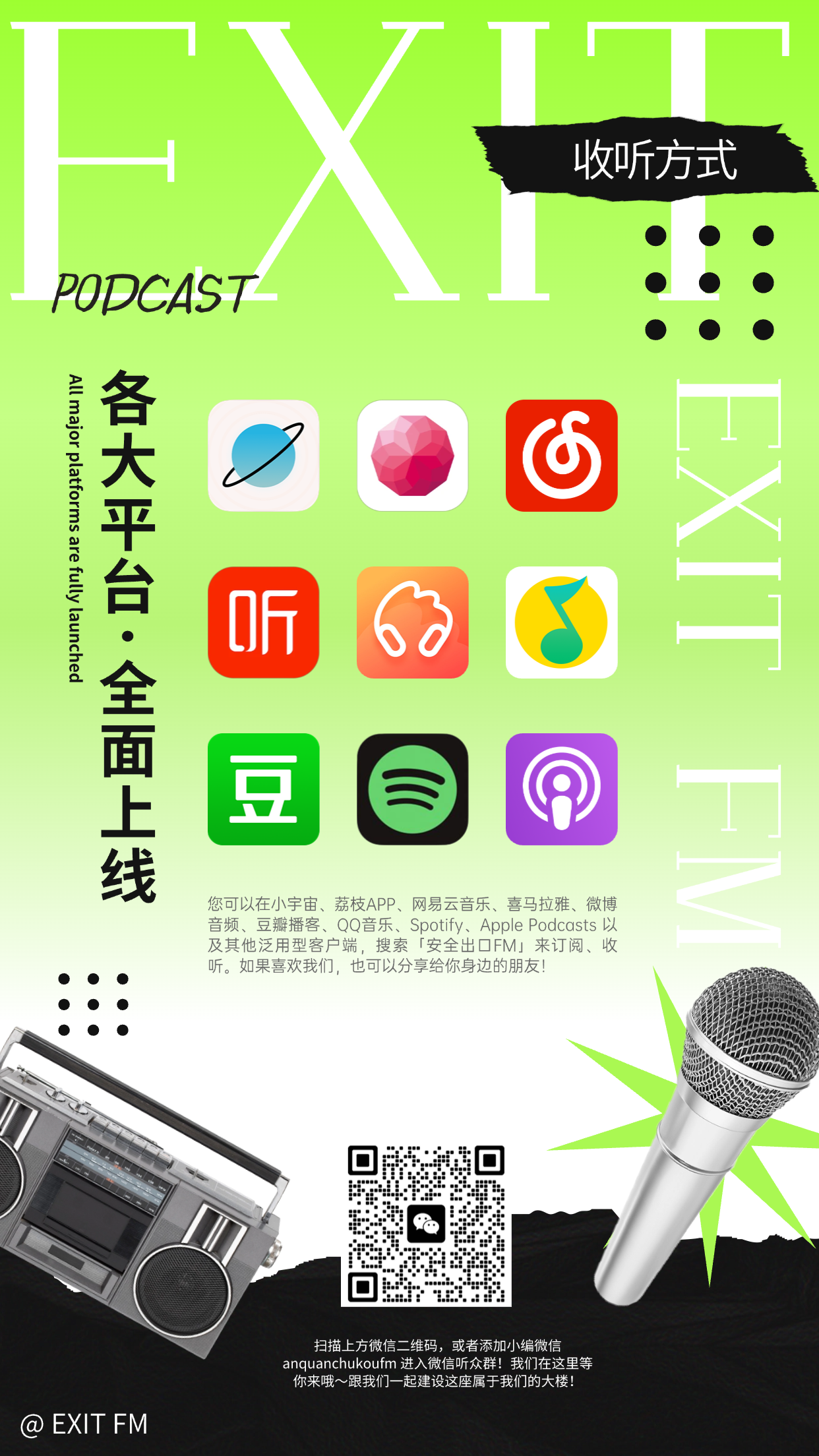 您可以在小宇宙、微博音频、喜马拉雅、网易云音乐、荔枝APP、QQ音乐、豆瓣播客、Apple Podcasts、Spotify以及其他泛用型客户端,搜索「安全出口FM」来订阅、收听。如果喜欢我们,也可以分享给你身边的朋友!