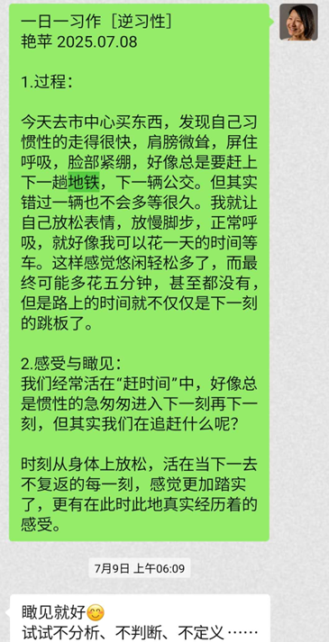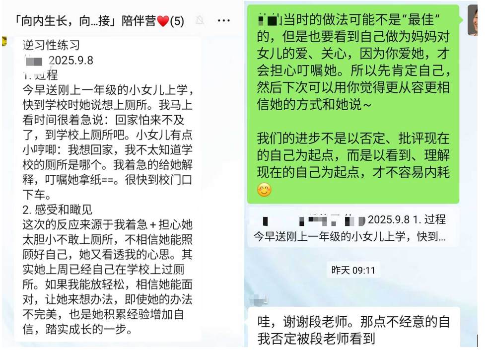 “ 我知道你最近一直很紧绷,因为你特别希望能够把这些事情做好,没关系,如果你想做好,可以继续这样去认真地做。但是如果你很累的时候,也可以让自己休息一下,然后再继续做。你可能那么多年都养成了批评自己的习惯,因为从小你都是被批评长大的现在你正在学习理解和包容自己。有的时候还是做不到,我们慢慢来。"