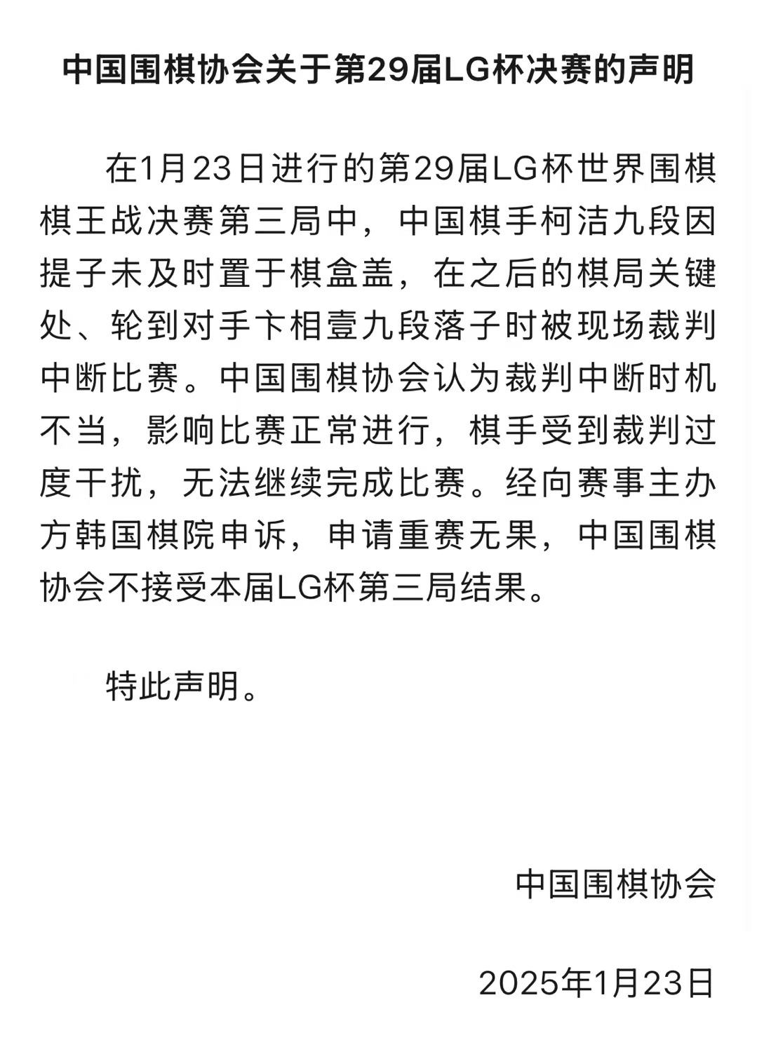 1月23日,知名围棋国手(8次世界冠军得主)柯洁在LG杯世界棋王赛中,因为裁判出现判罚争议,受到不公平待遇,愤而离场,后续中国围棋协会也发布了声明,表示不认可该判罚结果。此事引发热议,一度冲上微博热搜,本期播客,就详细和大家聊聊这事儿的来龙去脉。