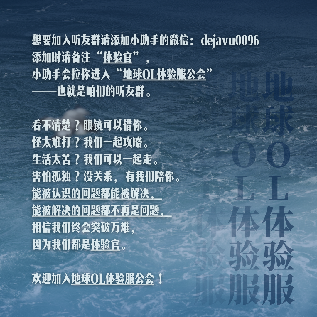 地球OL体验服,是针对地球这个开放世界的各种关卡和剧情打造的一档公会式节目。我们会在这里不定期分享地球OL攻略、奇遇体验以及聊天沙龙。在这个一生一次的游戏里,每个人都是独一无二的体验官。