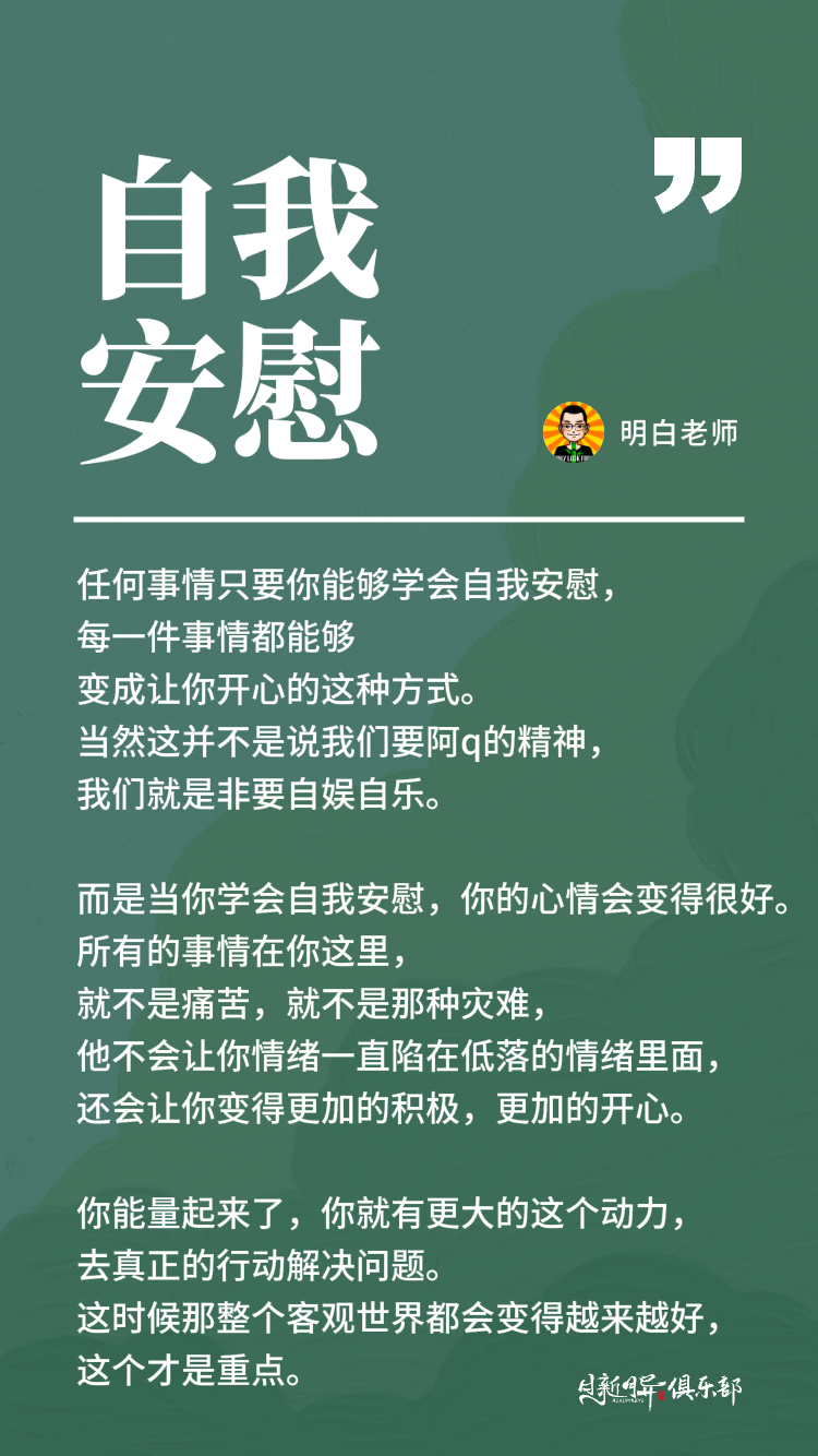 自我安慰,不是为了让别人开心,让别人觉得我怎么样,还是为了让自己可以,更好地产生下一步积极的行动,让自己的人生变得越来越好,所以学会自我安慰,人生就一定会越来越好。