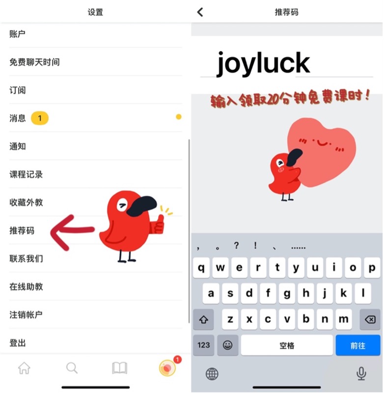 现在下载Cambly App或者登陆Cambly网页官网,注册登陆后输入喜福会的听友专属推荐码【joyluck】即可直接获得免费20分钟外教体验课时!购买月度套餐还可立享8折优惠!领取后可直接筛选有空时间并且搜索关键词:IELTS\BUSINESS\MOVIE等感兴趣话题匹配外教进行预约对话,也可以采用Cambly独有“即时通话”寻找在线外教进行对话练习。