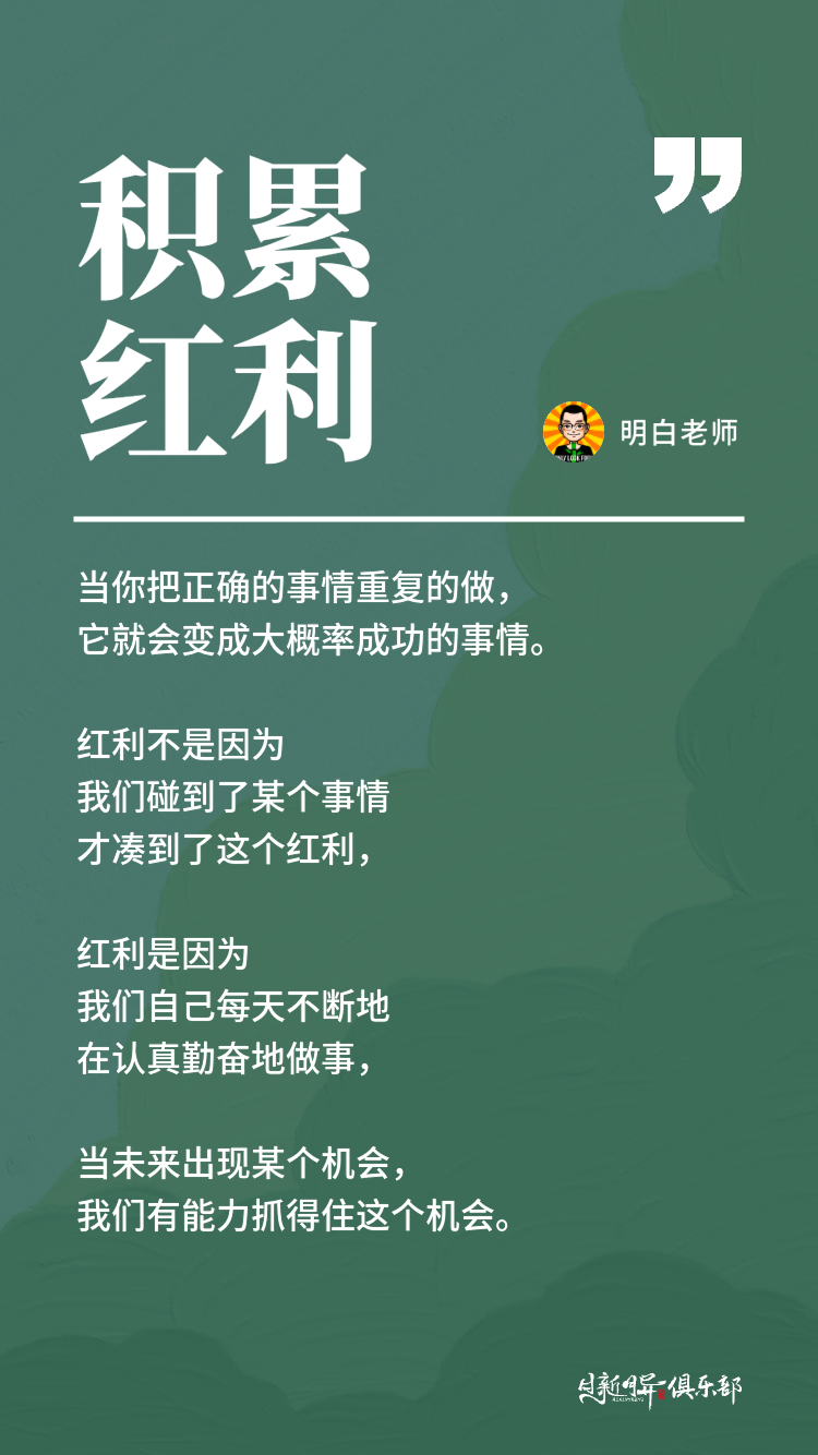 那你就会更有耐心,更有动力,以及更能沉得下心去坚持做一些正确的事情。当你把正确的事情重复的做,它就会变成大概率成功的事情,红利不是因为我们碰到了某个事情才凑到了这个红利,红利是因为我们自己每天不断的在认真勤奋地做事,当未来出现某个机会,我们有能力抓得住这个机会。