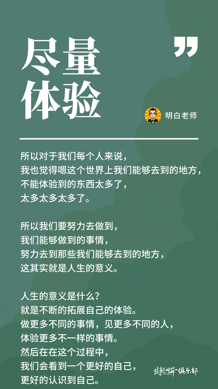 所以我们要努力去做到,我们能够做到的事情,努力去到那些我们能够去到的地方,这其实就是人生的意义。人生的意义是什么?这就是不断的拓展自己的体验。做更多不同的事情,见更多不同的人,体验更多不一样的事情。然后在在这个过程中,我们会看到一个更好的自己,更好的认识到自己。