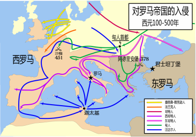 罗马帝国陷入动荡,日耳曼部落的哥特人、汪达尔人、匈人发动蛮族入侵致使罗马帝国衰落,还有一小撮盎格鲁撒克逊人此时开始进入英格兰岛屿