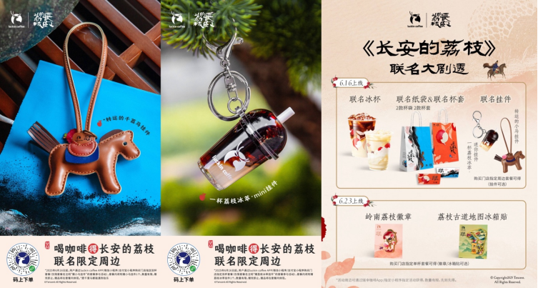 剧方同步打造了“周一荔会”“击鼓传荔”等线下活动,增强互动与代入感,并将岭南荔枝文化嵌入日常生活场景,引发社交平台广泛共鸣。广东文旅部门也以12小时极限冷链实现“真·千里送荔枝”,结合北京直播间制造现实版剧情复现,成功掀起“剧集+农产”的整合传播热潮。同时,瑞幸也上线“长安的荔枝”联名饮品系列,包含冻冻、冰萃与荔枝大福,并搭配IP周边如马挂件、杯套、徽章等,打通内容、饮品、文创的消费场景,实现从“看剧”到“喝剧”的完整路径。