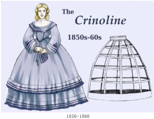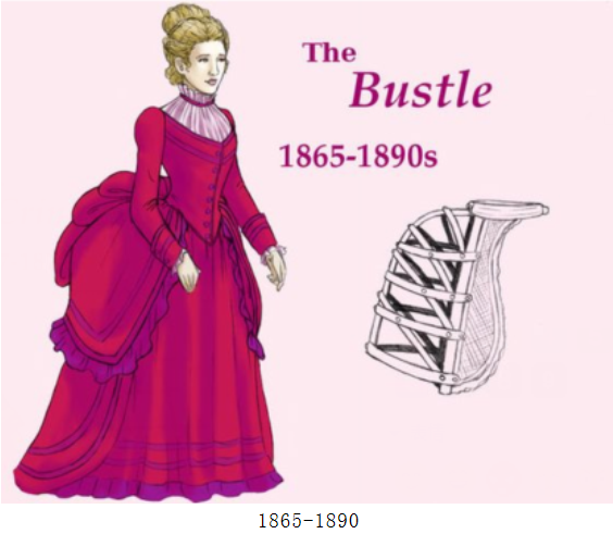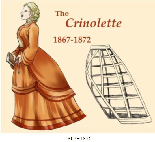 19世纪欧洲女性裙撑先是从1850年左右的圆顶屋形演变成1867-1872年的向后斜金字塔形,最后变成了巴斯尔时期(Bustle)的臀垫