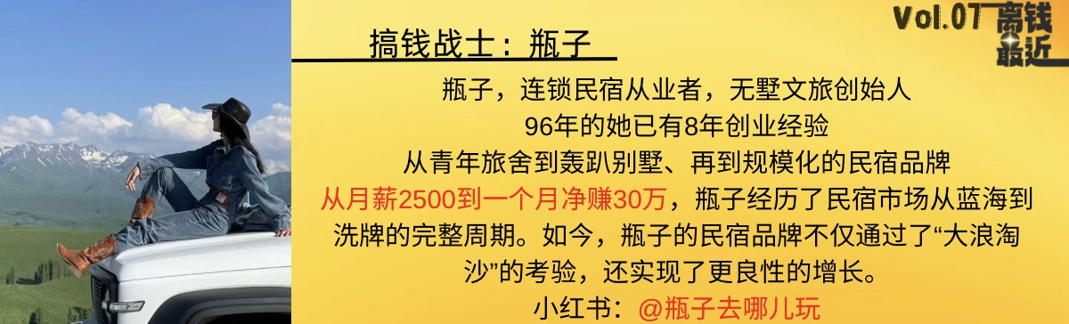 瓶子,连锁民宿从业者,无墅文旅创始人。96年的她已经有8年创业经验。从青年旅舍到轰趴别墅、再到规模化的民宿品牌,从月薪2500到一个月净赚30万,瓶子经历了民宿市场从蓝海到洗牌的完整周期。如今,瓶子的民宿品牌不仅在“大浪淘沙”下活了下来,并且实现了更良性的增长。