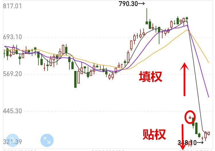 答案是贴权。除权后的股价没有上涨,而是在这基础上进一步下跌,这种现象就叫贴权,贴权的“贴”可以理解成“倒贴”的意思。图中的个股就属于贴权走势,因为除权后股价仍在下跌。如果除权后股价出现上涨,那就叫填权,因为股价在向上填补除权后留下的缺口,所以才有了填权的这个名词,填权的“填”就是填补的意思。如果股价再次涨回到除权前的高度,这种现象就叫充分填权,或者叫填满权。