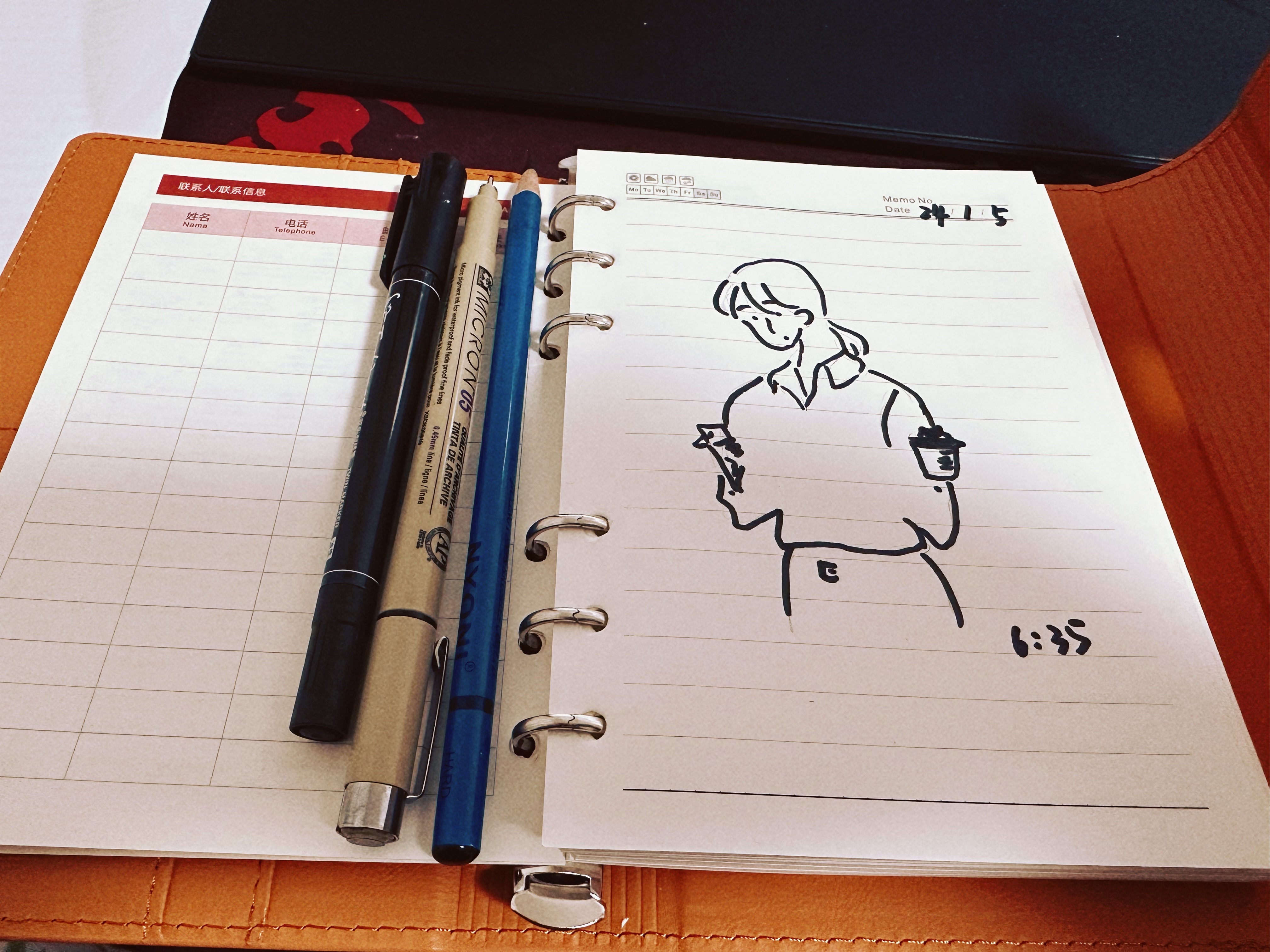 今天早上其实在微信读书里遇到一本书,叫做《妈妈都是艺术家》,我可能今天读了,后面的不会完全读完了,但是对我今天最大的帮助,就是我立马起身,去吧我的画笔整理了一下,把我的勾线笔找出来,并找到了一个笔记本,我还选择了下,有一本蓝色,一本橙色的,后来我选择了橙色的,然后临摹了一张速写。我觉得这本书对我的作用就达到了,我今天花5分钟画了一幅画。后面每天都画一幅。