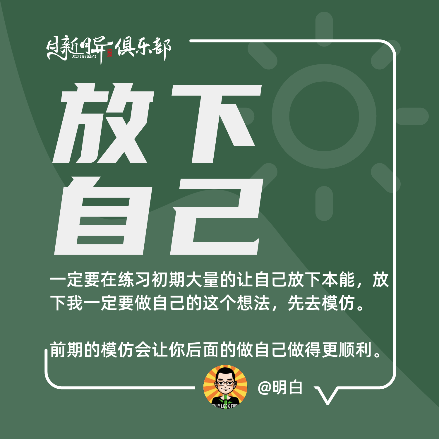 所以一定要在初期大量的让自己放下本能,放下我一定要做自己的这个想法,而是先去模仿,前期的模仿会让你后面的做自己做得更顺利。