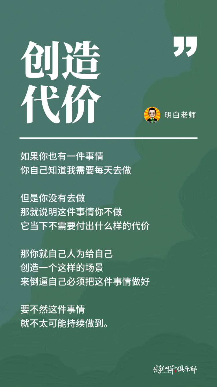 如果你也有一件事情你自己知道,我需要每天去做,但是你没有去做,那就说明这件事情你不做,它当下不需要付出什么样的代价。那你就自己人为给自己创造一个这样的场景,来倒逼自己必须把这件事情做好,要不然这件事情就不太可能持续做到。