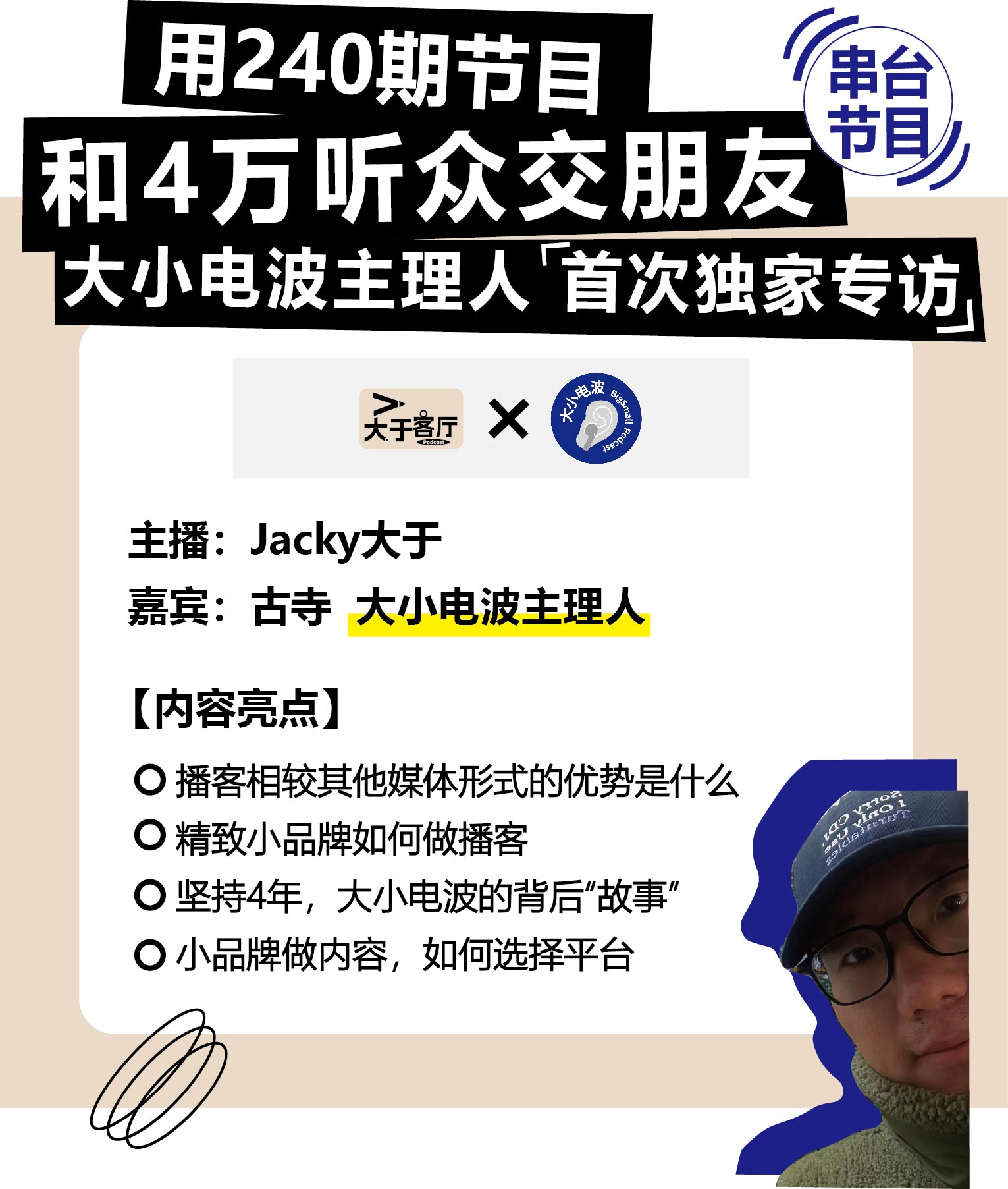 本期节目邀请到大小电波的主理人古寺老师。大小电波是大小咖啡咖啡馆里孵化的围绕精品吃喝的播客节目,上线4年时间,收获了全网超过4万粉丝,并在今年还开始尝试付费播客精品内容的制作。可以说,作为从精品咖啡馆生活方式品牌孵化而来的播客电台来说,取得了非常不错的成绩。