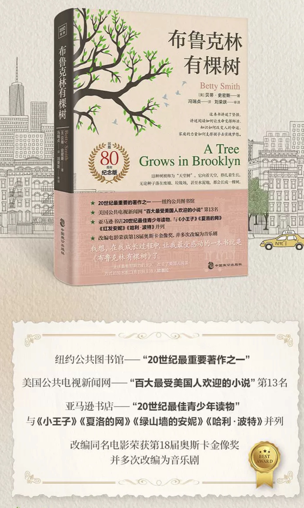 《布鲁克林有棵树》是美国作家贝蒂·史密斯于1943年出版的半自传体小说。被誉为20世纪美国文学经典之一,以细腻的笔触描绘了贫困家庭中一个女孩的成长历程,探讨了生存、希望与教育的力量。