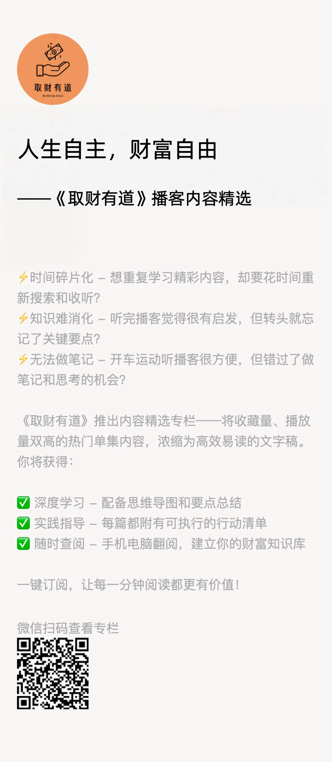 播客内容太多,没时间一集集反复听?精华观点总是一晃而过,难以沉淀为自己的知识?《取财有道》特别推出内容精选专栏一将收藏量、播放量双高的热门单集内容,浓缩为高效易读的文字稿,每篇都附上思维导图/实操建议,方便随时查阅。帮你节省时间、提升认知、加速财富成长。一键订阅,让你的每一分钟阅读都更有价值,点击下方链接,快来开启更加高效的理财新方式!
