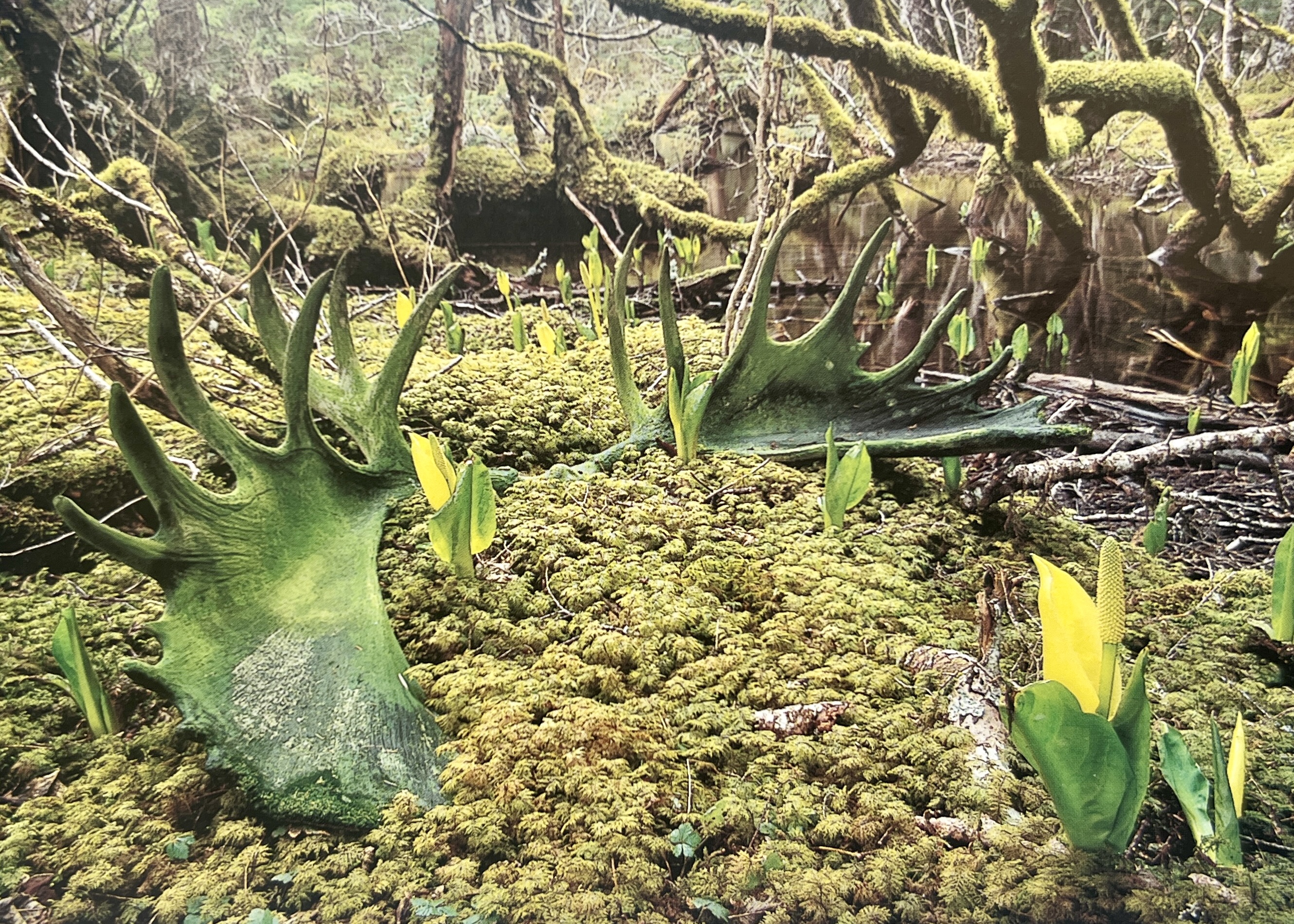 - 黄花水芭蕉 [西部臭菘]和长满青苔的驼鹿角。在食物极少的冬季,鹿角是生长在北极圈的啮齿类动物最重要的钙质来源。