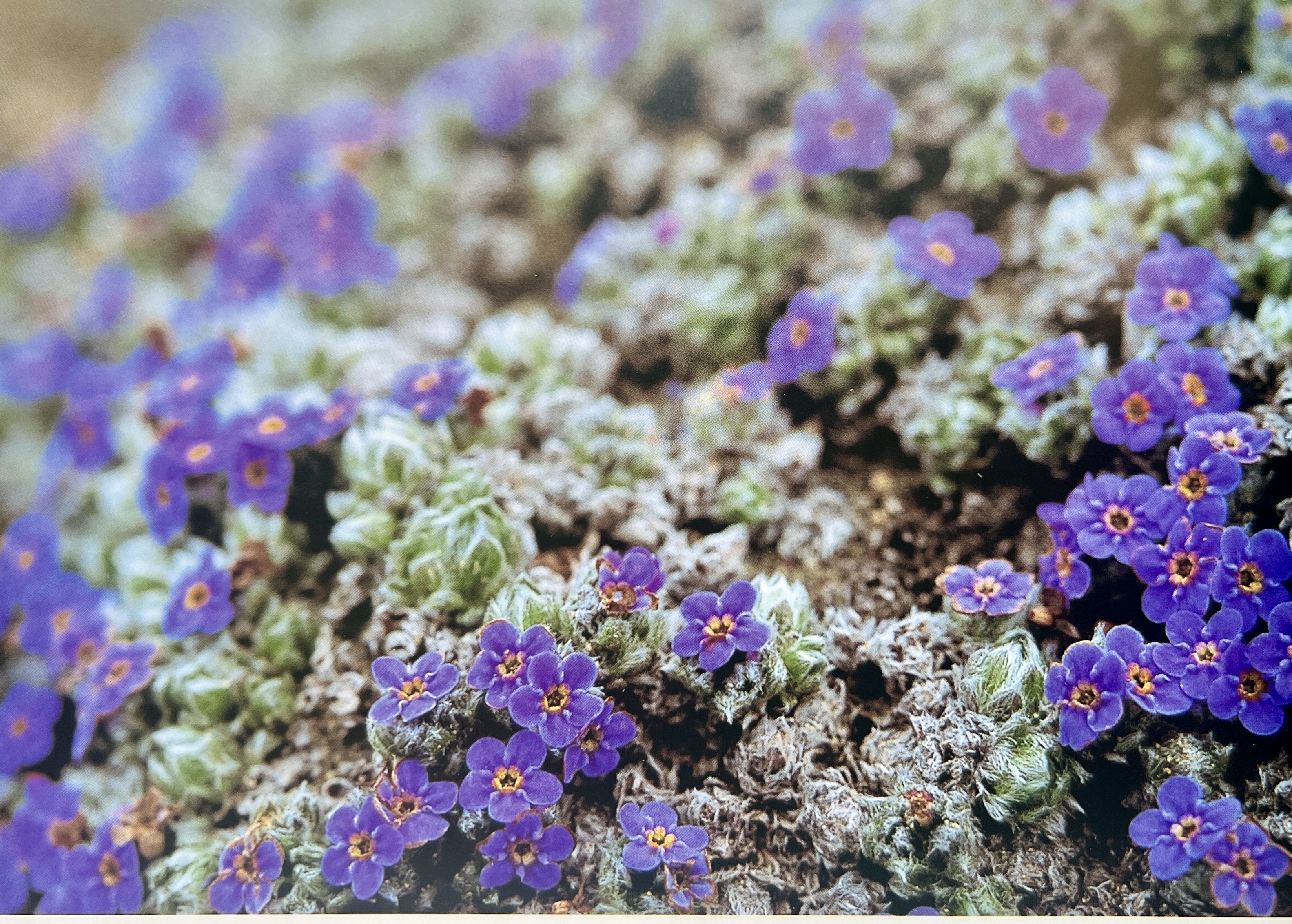- 贴着岩石下方生长的勿忘草,要仔细寻找才看得到。摄于圣保罗岛