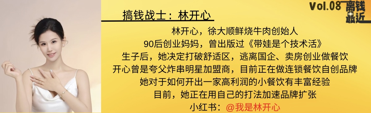 林开心,徐大顺鲜烧牛肉创始人,90后创业妈妈,曾出版过《带娃是个技术活》。结婚生子后,她决定打破舒适区,逃离国企、做自媒体博主、卖房创业做餐饮。林开心曾是夸父炸串明星加盟商,现在正在做连锁餐饮自创品牌,对于如何开出一家高利润的小餐饮有丰富经验。目前,她正在用自己的打法加速品牌扩张。