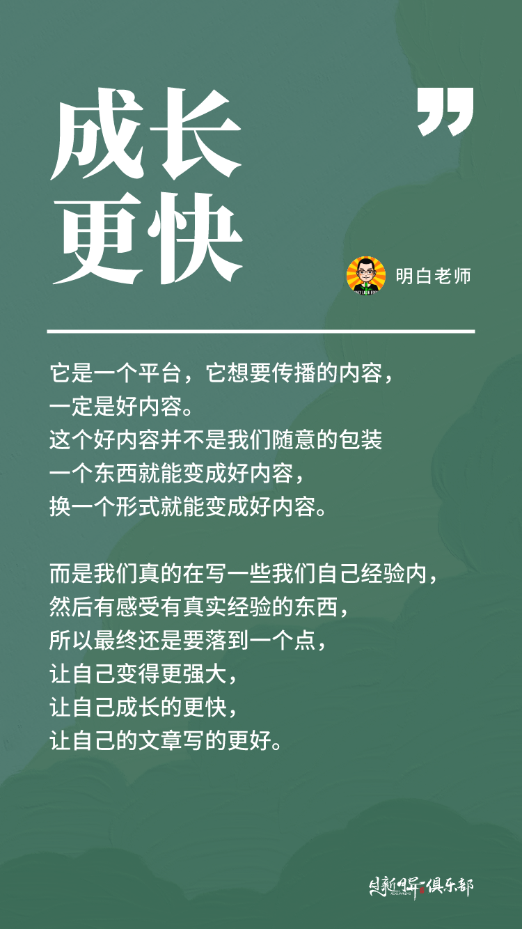 公众号也不是一个傻子,对不对?它是一个平台,它想要传播的内容,一定是好内容。这个好内容并不是我们随意的包装一个东西就能变成好内容,换一个形式就能变成好内容,而是我们真的在写一些我们自己经验内,然后有感受有真实经验的东西,所以最终还是要落到一个点,让自己变得更强大,让自己成长的更快,让自己的文章写的更好。