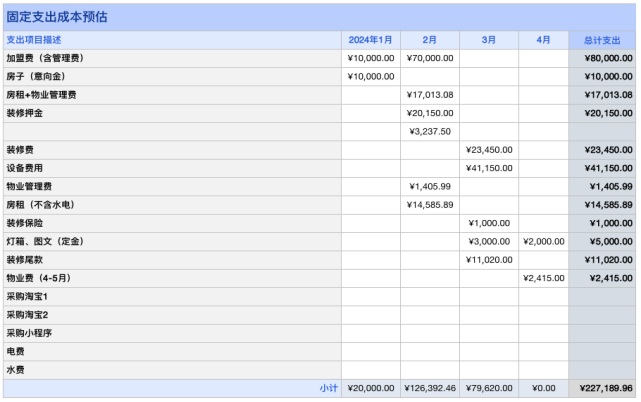 刘刘的店铺实际投资明细: