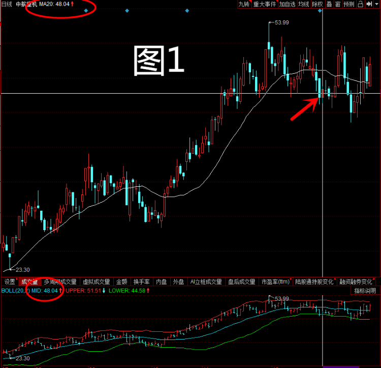 大家可以看一下文稿中的图1,上面是k线图、下面是布林指标图。为了方便参考,我在k线图中只设置了一条20日均线。然后看一下箭头所指的的日期,这一天该股的20日均线对应的价格是48.04元,而这一天布林指标的中轨线对应的价格也是48.04元,说明中轨线就等于k线图中的20日均线。