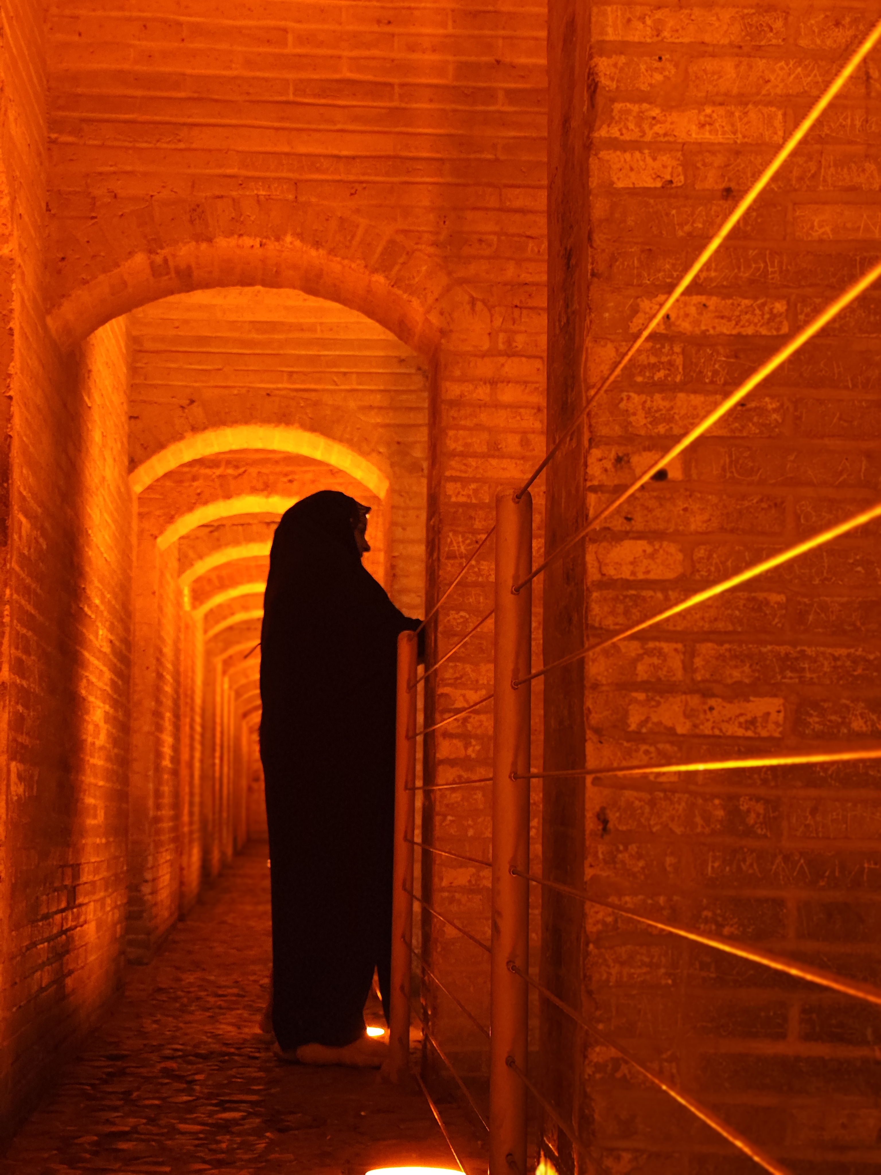 32:07 一位穆斯林老奶奶站在三十三孔桥上,橙色灯光和黑色罩袍的搭配,很有故事感。