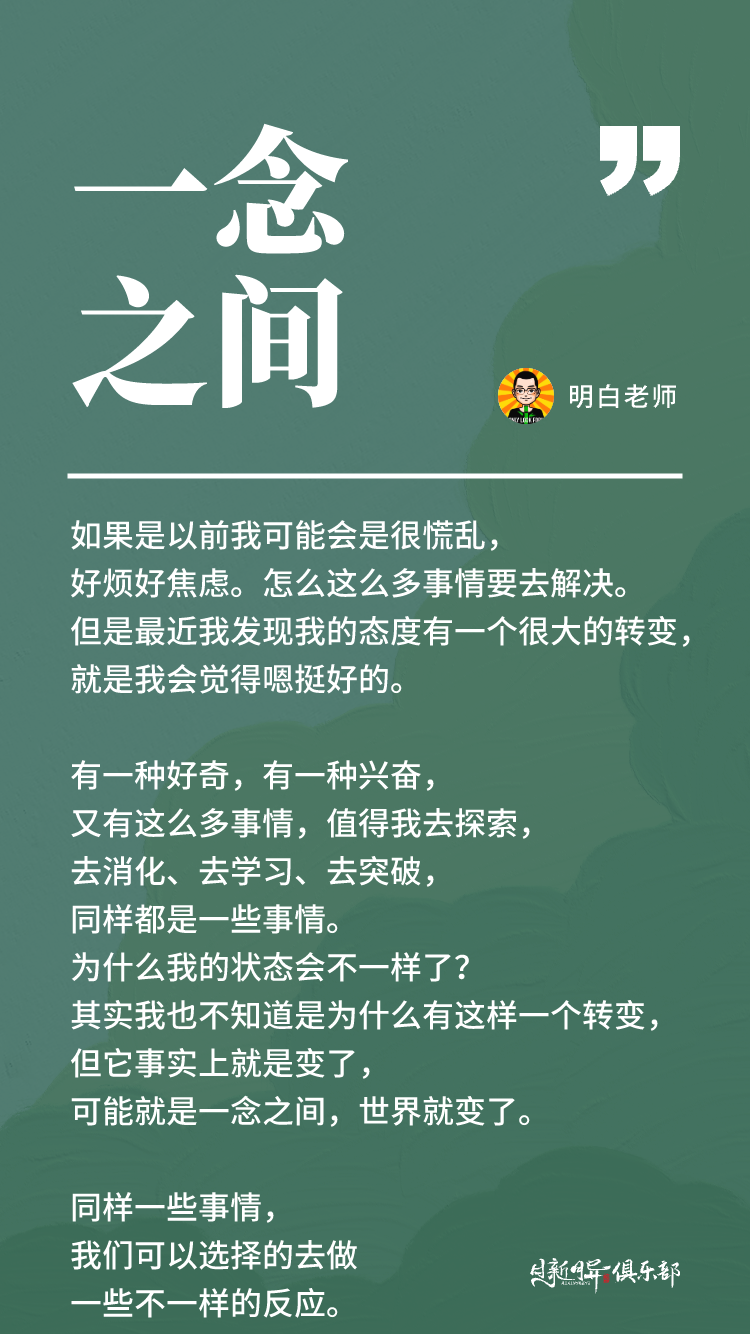 有一种好奇,有一种兴奋,又有这么多事情,值得我去探索,去消化、去学习、去突破,同样都是一些事情。为什么我的状态会不一样了?其实我也不知道是为什么有这样一个转变,但它事实上就是变了,可能就是一念之间,世界就变了。