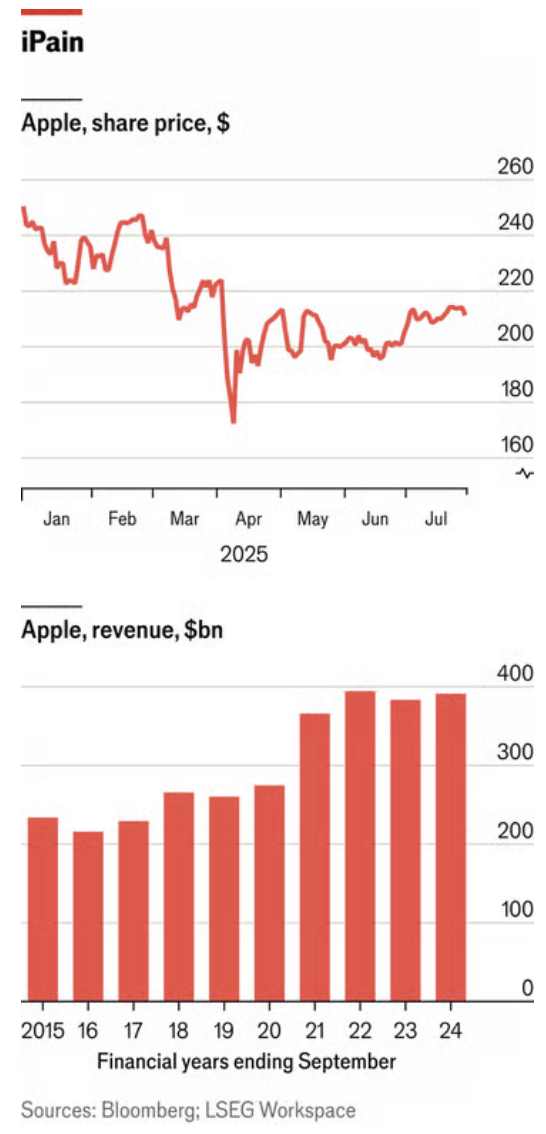 从更长远来看,苹果面临的问题更大。其人工智能战略方向不明,关键的AI科学家频频出走。一项针对谷歌的反垄断裁决,也可能危及谷歌每年约200亿美元的独家搜索引擎协议费用(即谷歌作为苹果设备默认搜索引擎的费用)。