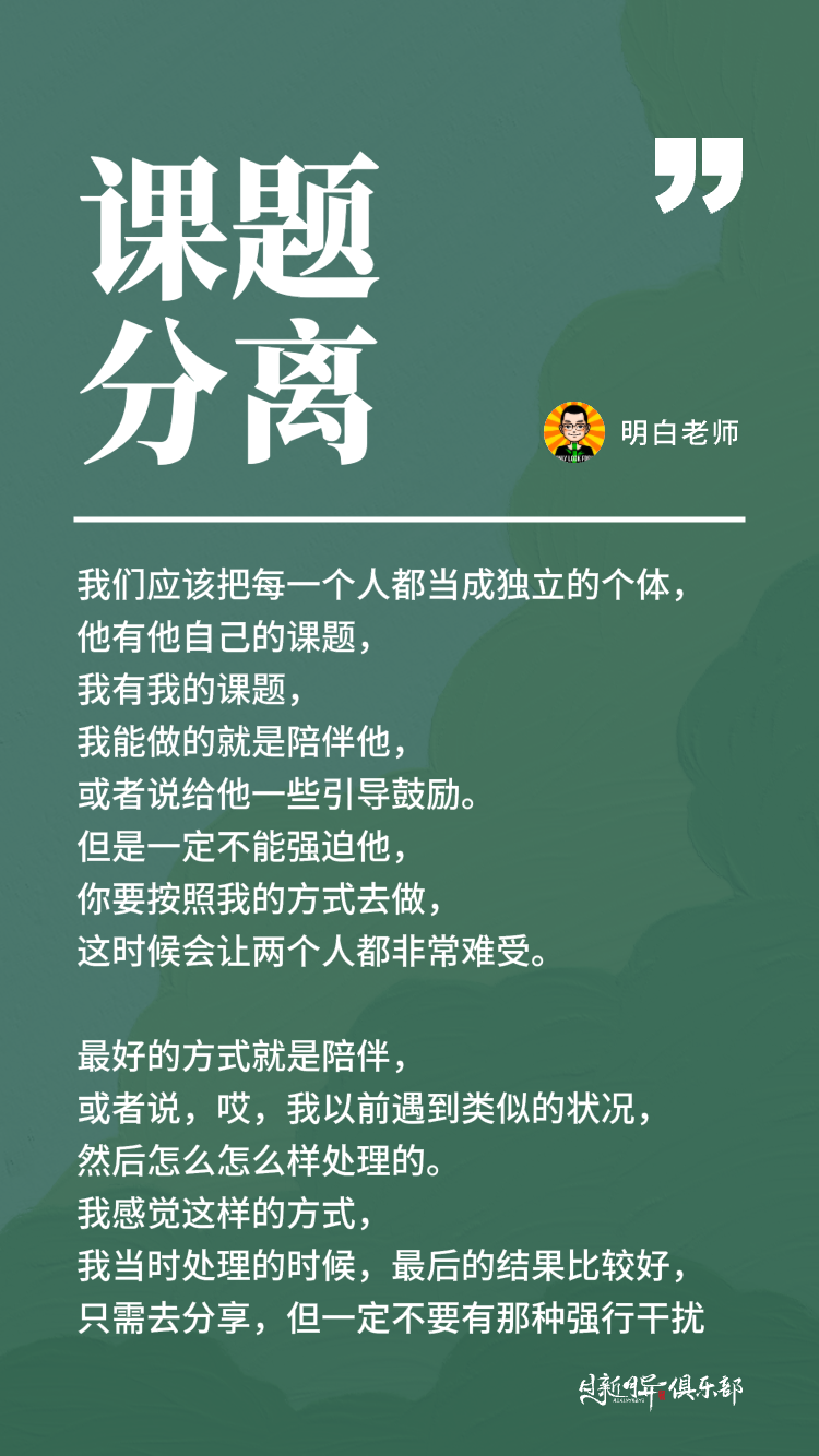 我们应该把每一个人都当成独立的个体,他有他自己的课题,我有我的课题,我能做的就是陪伴他,或者说给他一些引导鼓励。但是一定不能强迫他,你要按照我的方式去做,这时候会让两个人都非常难受,所以每个人都有自己的一些个人的独立的主观意志。