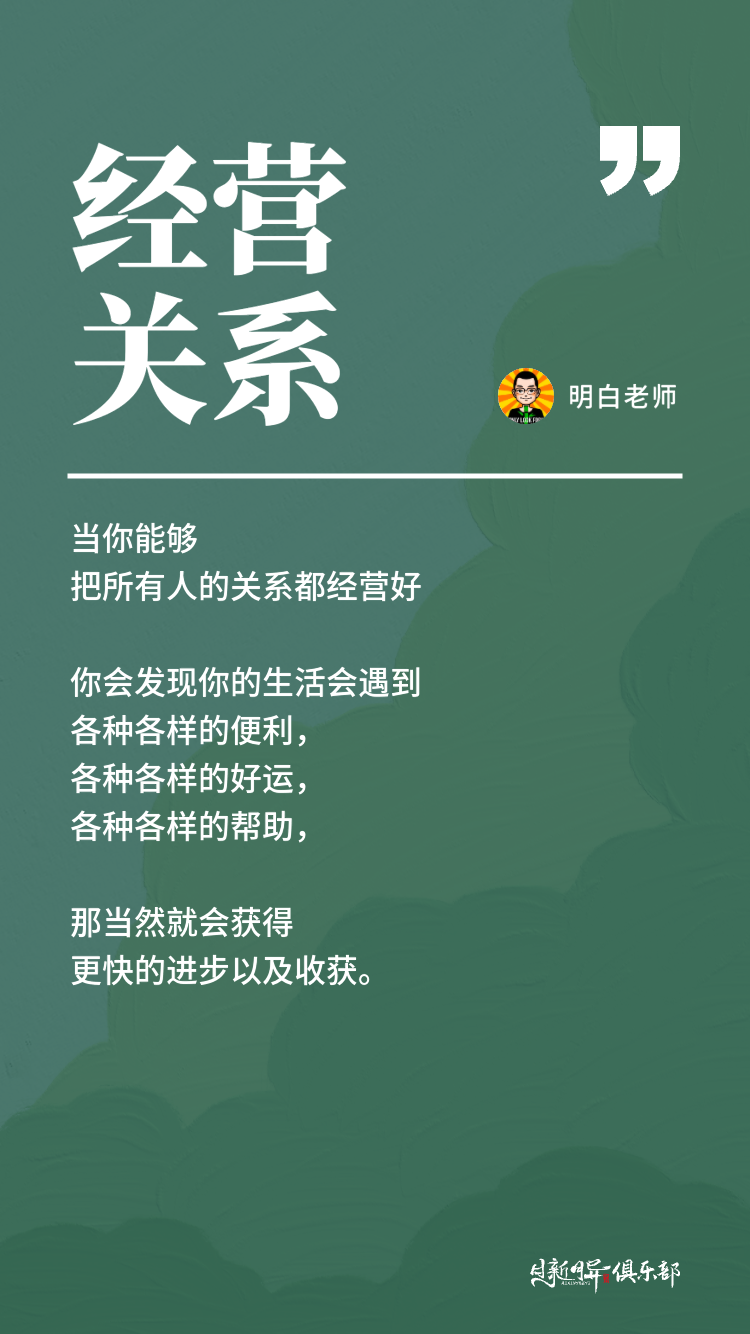 那你想想我们日常生活中,你要和另一半经营关系,你要和父母经营关系,你要和保安经营关系,你要和同事经营关系,你要和孩子经营关系,你要和网上的好友经营关系。