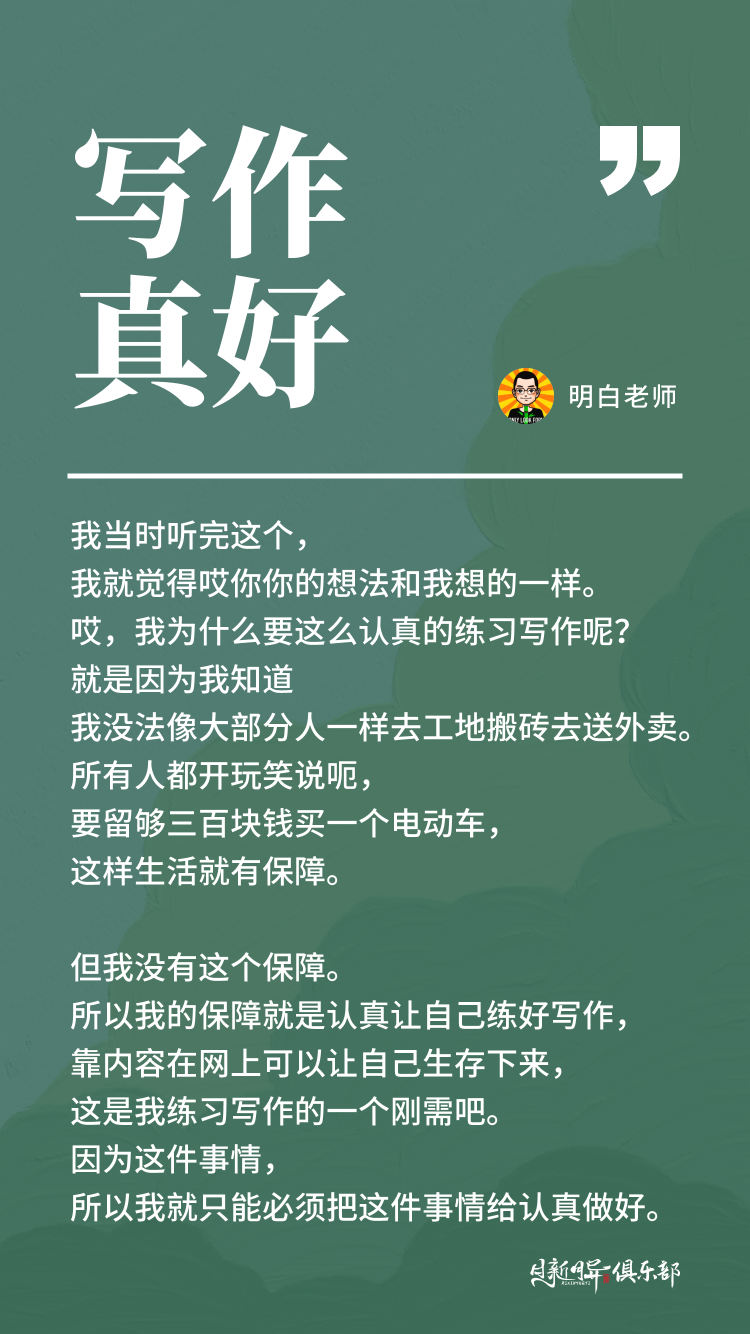 我当时听完这个,我就觉得哎你你的想法和我想的一样。哎,我为什么要这么认真的练习写作呢?就是因为我知道我没法像大部分人一样去那个去工地搬砖去送外卖。所有人都开玩笑说呃,要留够三百块钱买一个电动车,这样生活就有保障。