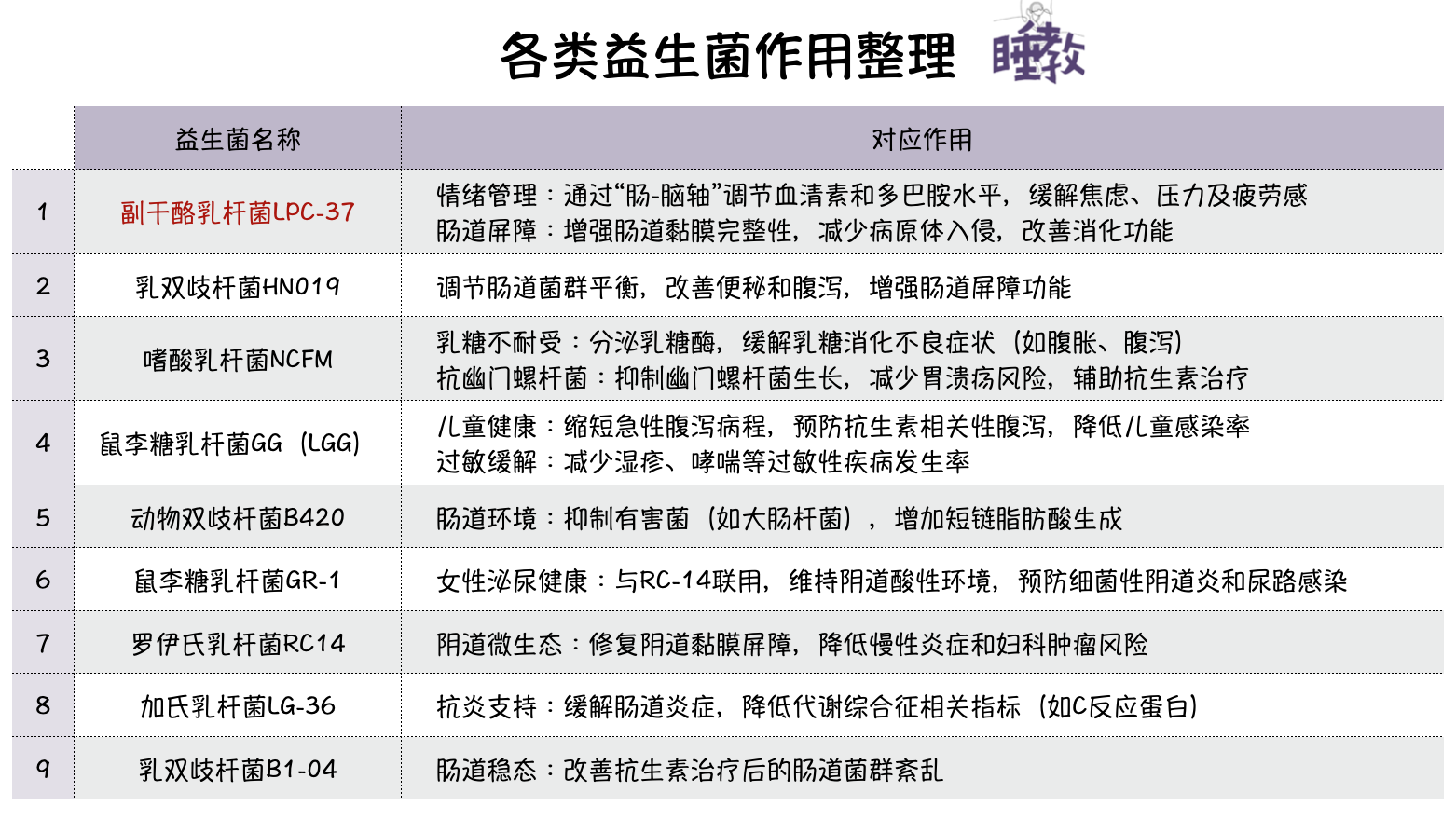 1:08:50 在学习时,Codie发现了一个特殊的菌种:副干酪乳杆菌LPC-37,可以调节血清素和多巴胺水平,缓解失眠。而在国内很有名气的一款益生菌里就添加了这种菌。但偏偏这款益生菌保健品里,菌的种类太多太多了(肯定超过10种),还能不能吃呢?——另一种补充益生菌的观点建议:补益生菌要么低于3种,要么大于10种!为啥咧?