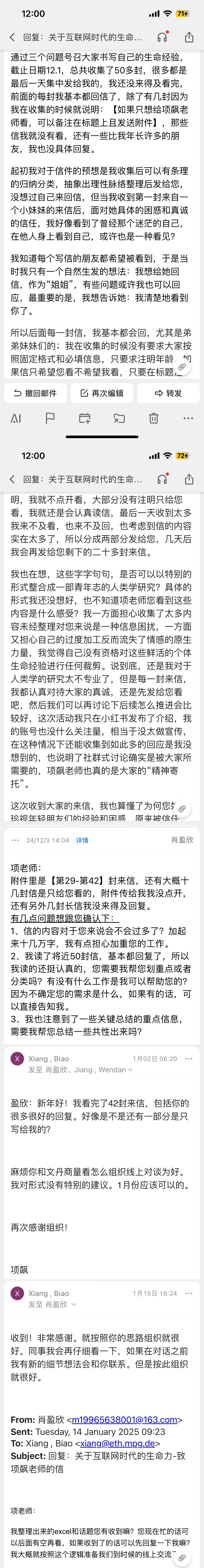 半个月的时间,收到了51封来信,总共15万字左右,2月份的时候,我们终于在线上和项飙老师见面了,播客是第一期的全过程(第二期后续发出),除了考虑部分同学的隐私情况,两个半小时几乎无剪辑呈现。