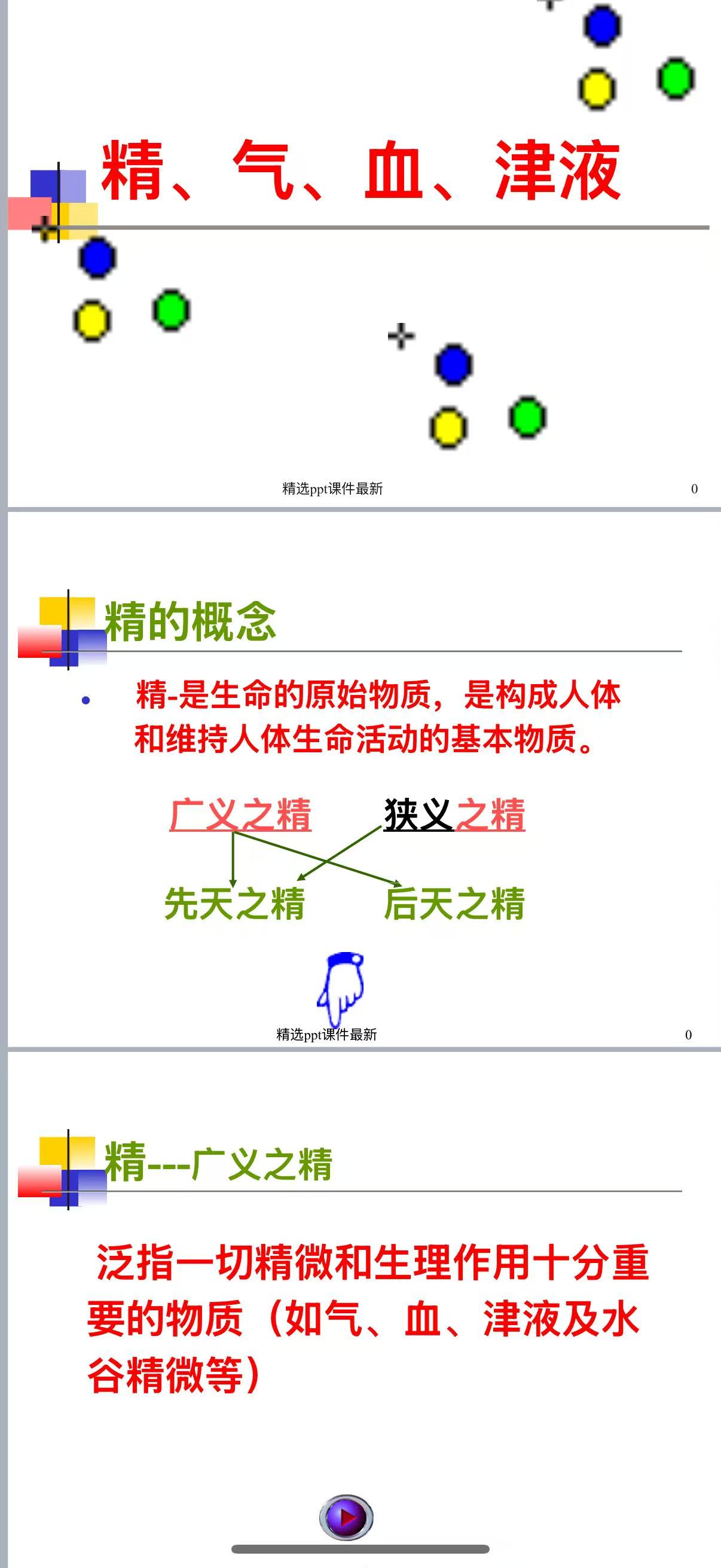 (一)精血同源精能化血,血能养精,精与血之间具有相互资生和相互转化的关系,称为“精血同源”。1、精可化血水谷之精和肾精是血液化生的基础物质。脾运化吸收的水谷之精,其精粹部分化为营气,与津液入于脉中,化赤为血;肾藏精,精髓为化血之源。由于肾为藏精之脏,故肾精化血的意义更为重要。肾之外华为发,肾精化血,荣养头发,故称“发为血之余”。肾精亏耗,可表现血虚病证,同时常见有头发枯槁脱落之候。2、血以养精血液充养脏腑可化生脏腑之精;血液滋养于肾,使肾精充实。故血液充盈则精足,血液虚少则精亏。临床常见肝血不足与肾精亏损,相互影响,表现为头晕眼花、耳聋耳鸣的肝肾精血亏虚病证。