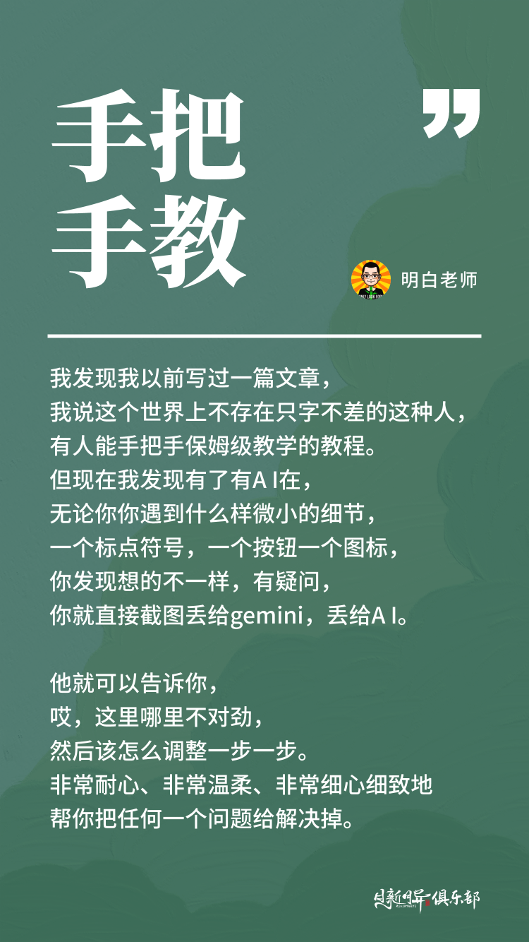 我发现我以前写过一篇文章,我说这个世界上不存在只字不差的这种人,有人能手把手保姆级保保姆级教学的教程。但现在我发现有了有A I在,无论你你遇到什么样微小的细节,一个标点符号,一个按钮一个图标,你发现想的不一样,有疑问,你就直接截图丢给gemini,丢给A I,他就可以告诉你,哎,这里哪里不对劲,然后该怎么调整一步一步。