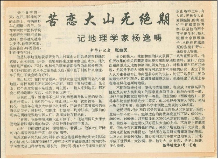 1993年4月19日,以我所见地理学家杨逸畴奋斗精神为据,写了“苦恋大山无绝期”一文以新华社通稿发出。图为刊于报纸的稿件。(嘉宾提供)